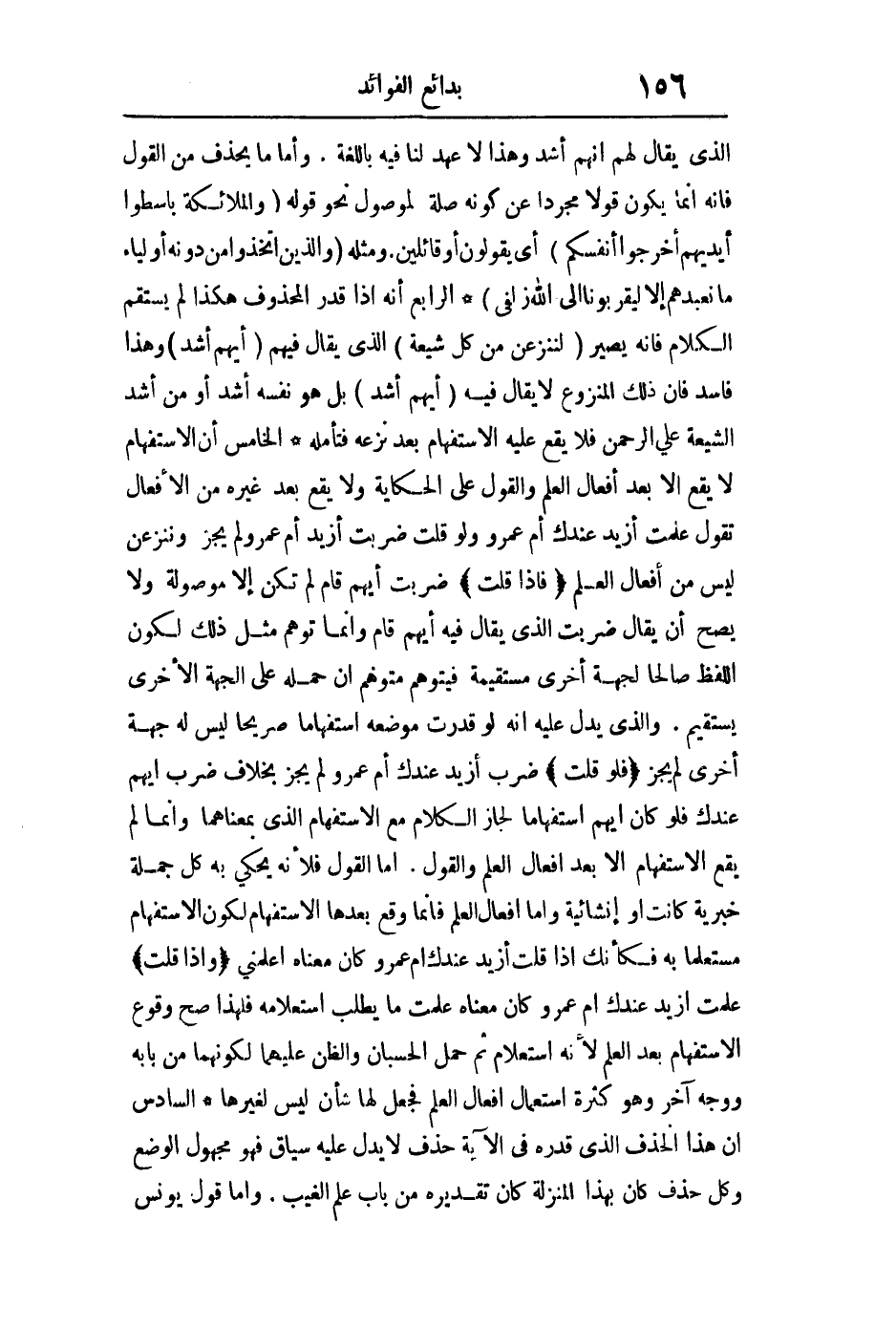 الذي يقال لهم إنهم أشد وهذا لا عهد لنا فيه باللغة وأما ما يحذف من القول فإنه إنما يكون قولا مجردا عن كونه صلة لموصول نحو قوله: {وَالْمَلائِكَةُ بَاسِطُو أَيْدِيهِمْ أَخْرِجُوا أَنْفُسَكُمُ} أي يقولون أو قائلين ومثله: {وَالَّذِينَ اتَّخَذُوا مِنْ دُونِهِ أَوْلِيَاءَ مَا نَعْبُدُهُمْ إِلاّ لِيُقَرِّبُونَا إِلَى اللَّهِ زُلْفَى} الرابع: أنه إذا قدر المحذوف هكذا لم يستقم الكلام فإنه يصير {لَنَنْزِعَنَّ مِنْ كُلِّ شِيعَةٍ} الذين يقال فيهم {أَيُّهُمْ أَشَدُّ} وهذا فاسد فإن ذلك المنزوع لا يقال فيه: {أَيُّهُمْ أَشَدُّ} بل هو نفسه أشد أو من أشد الشيعة على الرحمن فلا يقع عليه الاستفهام بعد نزعه فتأمله الخامس: أن الاستفهام لا يقع إلا بعد أفعال العلم والقول على الحكاية ولا يقع بعد غيره من الأفعال تقول علمت أزيد عندك أم عمرو ولو قلت ضربت أزيد أم عمرو لم يجز وننزعن ليس من أفعال العلم فإذا قلت: ضربت أيهم قام لم تكن إلا موصولة ولا يصح أن يقال ضربت الذي يقال فيه أيهم قام وإنما توهم مثل ذلك لكون اللفظ صالحا لجهة أخرى مستقيمة فيتوهم متوهم أن حمله على الجهة الأخرى يستقيم والذي يدل عليه أنه لو قدرت موضعه استفهاما صريحا ليس له جهة أخرى لم يجز فإذا قلت: ضرب أزيد عندك أم عمرو لم يجز بخلاف ضرب أيهم عندك فلو كان أيهم استفهاما لجاز الكلام مع الاستفهام الذي بمعناهما وإنما لم يقع الاستفهام إلا بعد أفعال العلم والقول أما القول فلأنه يحكي به كل جملة خبرية كانت أو إنشائية وأما أفعال العلم فإنما وقع بعدها الاستفهام لكون الاستفهام مستعلما به فكأنك إذا قلت: أزيد عندك أم عمرو كان معناه أعلمني وإذا قلت: علمت أزيد عندك أم عمرو كان معناه علمت ما يطلب استعلامه فلهذا صح وقوع الاستفهام بعد العلم لأنه استعلام ثم حمل الحسبان والظن عليهما لكونهما من بابه ووجه آخر وهو كثرة استعمال أفعال العلم فجعل شأن ليس لغيرها السادس: أن هذا الحذف الذي قدره في الآية حذف لا يدل عليه سياق فهو مجهول الوضع وكل حذف كان بهذه المنزلة كان تقديره من باب علم الغيب وأما قول يونس بن حبيب