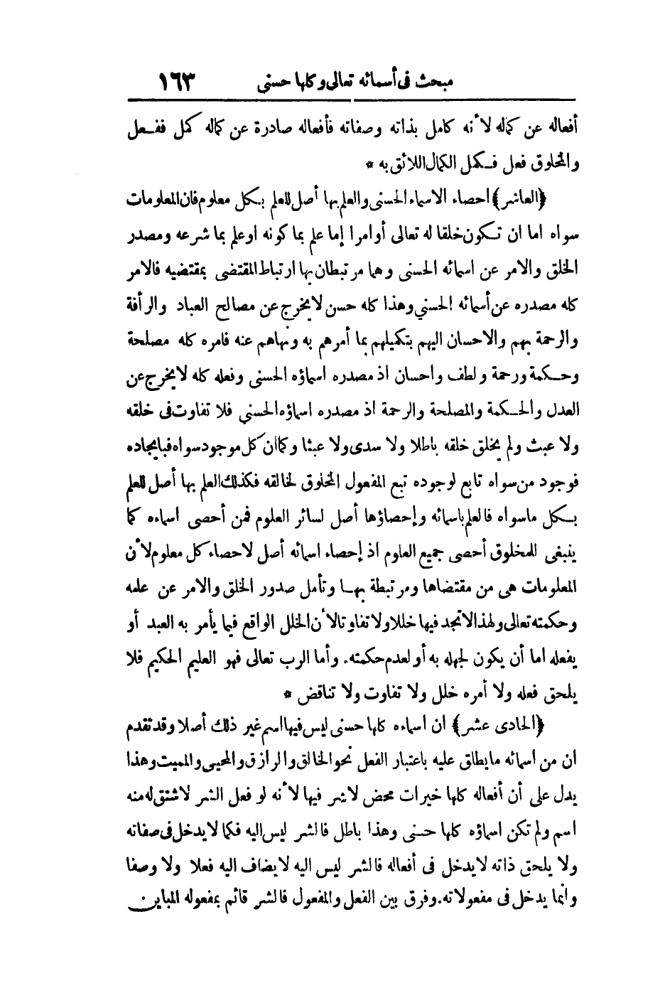 أفعاله عن كماله لأنه كامل بذاته وصفاته فأفعاله صادرة عن كماله كمل ففعل والمخلوق فعل فكمل الكمال اللائق به العاشر: إحصاء الأسماء الحسنى والعلم بها أصل للعلم بكل معلوم فإن المعلومات سواه إما أن تكون خلقا له تعالى أو أمرا إما علم بما كونه أو علم بما شرعه ومصدر الخلق والأمر عن أسمائه الحسنى وهما مرتبطان بها ارتباط المقتضى بمقتضيه فالأمر كله مصدره عن أسمائه الحسنى وهذا كله حسن لا يخرج عن مصالح العباد والرأفة والرحمة بهم والإحسان إليهم بتكميلهم بما أمرهم به ونهاهم عنه فأمره كله مصلحة وحكمة ولطف وإحسان إذ مصدره أسماؤه الحسنى وفعله كله لا يخرج عن العدل والحكمة والمصلحة والرحمة إذ مصدره أسماؤه الحسنى فلا تفاوت في خلقه ولا عبث ولم يخلق خلقه باطلا ولا سدى ولا عبثا وكما أن كل موجود سواه فبإيجاده فوجود من سواه تابع لوجوده تبع المفعول المخلوق لخالقه فكذلك العلم بها أصل للعلم بكل ما سواه فالعلم بأسمائه وإحصاؤها أصل لسائر العلوم فمن أحصى أسماءه كما ينبغي للمخلوق أحصى جميع العلوم إذ إحصاء أسمائه أصل لإحصاء كل معلوم لأن المعلومات هي من مقتضاها ومرتبطة بها وتأمل صدور الخلق والأمر عن علمه وحكمته تعالى ولهذا لا تجد فيها خللا ولا تفاوتا لأن الخلل الواقع فيما يأمر به العبد أو يفعله إما أن يكون لجهله به أو لعدم حكمته وأما الرب تعالى فهو العليم الحكيم فلا يلحق فعله ولا أمره خلل ولا تفاوت ولا تناقض