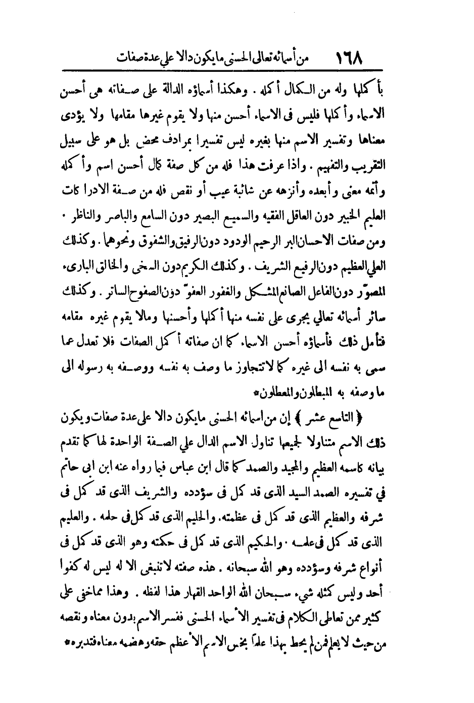 التاسع عشر: أن من أسمائه الحسنى ما يكون دالا على عدة صفات ويكون ذلك الاسم متناولا لجميعها تناول الاسم الدال على الصفة الواحدة لها كما تقدم بيانه كاسمه العظيم والمجيد والصمد كما قال ابن عباس: فيما رواه عنه ابن أبي حاتم في تفسيره: "الصمد: السيد الذي قد كمل في سؤدده والشريف: الذي قد كمل في شرفه والعظيم: الذي قد كمل في عظمته والحليم الذي قد كمل في حلمه والعليم الذي قد كمل في علمه والحكيم الذي قد كمل في حكمته وهو الذي قد كمل في أنواع شرفه وسؤدده وهو الله سبحانه إسناده ضعيف" هذه صفته لا تنبغي إلا له ليس له كفوا أحد وليس كمثله شيء سبحان الله الواحد القهار هذا لفظه وهذا مما خفي على كثير ممن تعاطى الكلام في تفسير الأسماء الحسنى ففسر الاسم بدون معناه ونقصه من حيث لا يعلم فمن لم يحط بهذا علما بخس الاسم الأعظم حقه وهضمه معناه فتدبره.
