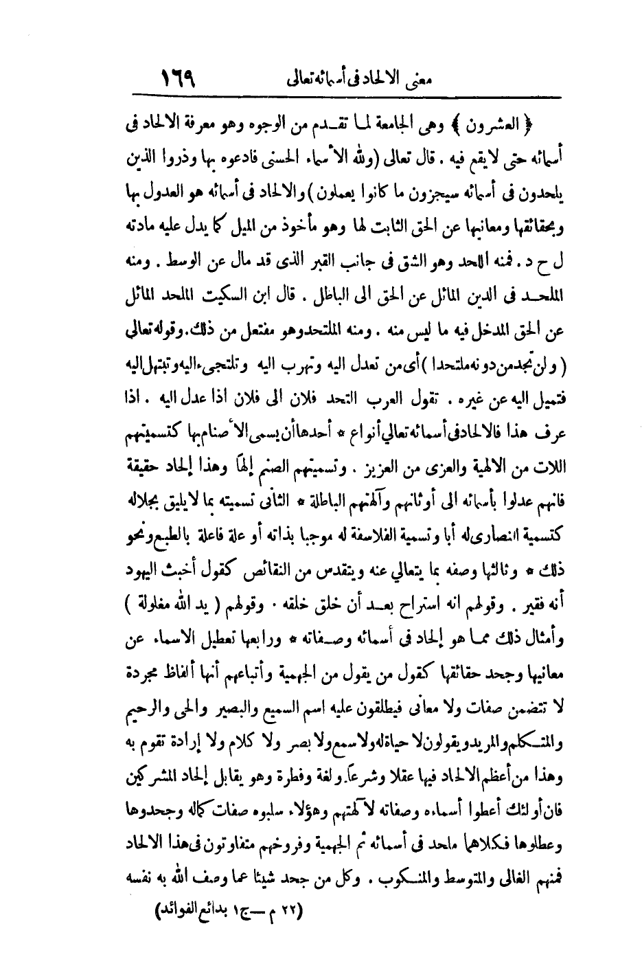العشرون: وهي الجامعة لما تقدم من الوجوه وهي معرفة الإلحاد في أسمائه حتى لا يقع فيه قال تعالى: {وَلِلَّهِ الأسماء الْحُسْنَى فَادْعُوهُ بِهَا وَذَرُوا الَّذِينَ يُلْحِدُونَ فِي أَسْمَائِهِ سَيُجْزَوْنَ مَا كَانُوا يَعْمَلُونَ} والإلحاد في أسمائه هو العدول بها وبحقائقها ومعانيها عن الحق الثابت لها وهو مأخوذ من الميل كما يدل عليه مادته ل ح د فمنه اللحد وهو الشق في جانب القبر الذي قد مال عن الوسط ومنه الملحد في الدين المائل عن الحق إلى الباطل قال ابن السكيت: "الملحد المائل عن الحق المدخل فيه ما ليس منه" ومنه الملتحد وهو مفتعل من ذلك وقوله تعالى: {وَلَنْ تَجِدَ مِنْ دُونِهِ مُلْتَحَداً} أي من تعدل إليه وتهرب إليه وتلتجئ إليه وتبتهل فتميل إليه عن غيره تقول العرب التحد فلان إلى فلان إذا عدل إليه إذا عرف هذا فالإلحاد في أسمائه تعالى أنواع أحدها: أن يسمى الأصنام بها كتسميتهم اللات من الإلهية والعزى من العزيز وتسميتهم الصنم إلها وهذا إلحاد حقيقة فإنهم عدلوا بأسمائه إلى أوثانهم وآلهتهم الباطلة الثاني: تسميته بما لا يليق بجلاله كتسمية النصارى له أبا وتسمية الفلاسفة له موجبا بذاته أو علة فاعلة بالطبع ونحو ذلك وثالثها: وصفه بما يتعالى عنه ويتقدس من النقائص كقول أخبث اليهود إنه فقير وقولهم إنه استراح بعد أن خلق خلقه وقولهم: {يَدُ اللَّهِ مَغْلُولَةٌ} وأمثال ذلك مما هو إلحاد في أسمائه وصفاته ورابعها: تعطيل الأسماء عن معانيها وجحد حقائقها كقول من يقول من الجهمية وأتباعهم إنها ألفاظ مجردة لا تتضمن صفات ولا معاني فيطلقون عليه اسم السميع والبصير والحي والرحيم والمتكلم والمريد ويقولون لا حياة له ولا سمع ولا بصر ولا كلام ولا إرادة تقوم به وهذا من أعظم الإلحاد فيها عقلا وشرعا ولغة وفطرة وهو يقابل إلحاد المشركين فإن أولئك أعطوا أسماءه وصفاته لآلهتهم وهؤلاء سلبوه صفات كماله وجحدوها وعطلوها فكلاهما ملحد في أسمائه ثم الجهمية وفروخهم متفاوتون في هذا الإلحاد فمنهم الغالي والمتوسط والمنكوب وكل من جحد شيئا عما وصف الله به نفسه