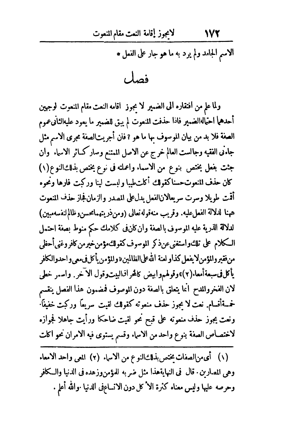 ولما علم من افتقاره إلى الضمير لا يجوز إقامة النعت مقام المنعوت لوجهين أحدهما احتماله الضمير فإذا حذفت المنعوت لم يبق للضمير ما يعود عليه الثاني عموم الصفة فلا بد من بيان الموصوف بها ما هو فإن أجريت الصفة مجرى الاسم مثل جاءني الفقيه وجالست العالم خرج عن الأصل الممتنع وصار كسائر الأسماء وإن جئت بفعل يختص بنوع من الأسماء وأعملته في نوع يختص بذلك النوع كان حذف المنعوت حسنا كقولك أكلت طيبا ولبست لينا وركبت فارها ونحوه أقمت طويلا وسرت سريعا لأن الفعل يدل على المصدر والزمان فجاز حذف المنعوت هاهنا لدلالة الفعل عليه وقريب منه قوله تعالى: {وَمِنْ ذُرِّيَّتِهِمَا مُحْسِنٌ وَظَالِمٌ لِنَفْسِهِ مُبِينٌ} لدلالة الذرية على الموصوف بالصفة وإن كان في كلامك حكم منوط بصفة احتمل الكلام على تلك واستغنى عن ذكر الموصوف كقولك مؤمن خير من كافر وغني أحظى من فقير والمؤمن لا يفعل كذا ولعنة الله على الظالمين: "والمؤمن يأكل في معي واحد والكافر يأكل في سبعة أمعاء" رواه مسلم وقولهم: وأبيض كالمخراق البيت وقول الآخر: وأسمر خطي لأن الفخر والمدح إنما يتعلق بالصفة دون الموصوف فمضمون هذا الفصل ينقسم خمسة أقسام: نعت لا يجوز حذف منعوته كقولك لقيت سريعا وركبت خفيفا ونعت يجوز حذف منعوته على قبح نحو لقيت ضاحكا ورأيت جاهلا فجوازه لاختصاص الصفة بنوع واحد من الأسماء وقسم يستوي فيه الأمران نحو: أكلت