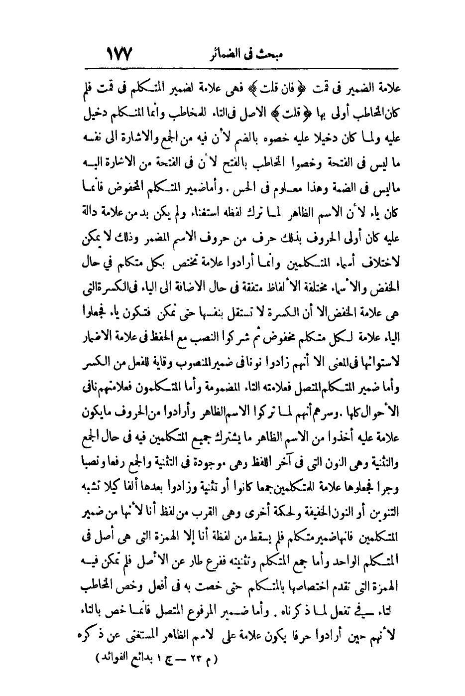 علامة الضمير في قمت فإن قلت: فهي علامة لضمير المتكلم في قمت فلم كان المخاطب أولى بها قلت: الأصل في التاء للمخاطب وإنما المتكلم دخيل عليه ولما كان دخيلا عليه خصوه بالضم لأن فيه من الجمع والإشارة إلى نفسه ما ليس في الفتحة وخصوا المخاطب بالفتح لأن في الفتحة من الإشارة إليه ما ليس في الضمة وهذا معلوم في الحس وأما ضمير المتكلم المخفوض فإنما كان ياء لأن الاسم الظاهر لما ترك لفظه استغناء ولم يكن بد من علامة دالة عليه كان أولى الحروف بذلك حرف من حروف الاسم المضمر وذلك لا يمكن لاختلاف أسماء المتكلمين وإنما أرادوا علامة تختص بكل متكلم في حال الخفض والأسماء مختلفة الألفاظ متفقة في حال الإضافة إلى الياء في الكسرة التي هي علامة الخفض إلا أن الكسرة لا تستقل بنفسها حتى تمكن فتكون ياء فجعلوا الياء علامة لكل متكلم مخفوض ثم شركوا النصب مع الحفظ في علامة الإضمار لاستوائها في المعنى إلا أنها زادوا نونا في ضمير المنصوب وقاية للفعل من الكسر وأما ضمير المتكلم المتصل فعلامته التاء المضمومة وأما المتكلمون فعلامتهم نافي الأحوال كلها وسرهم أنهم لما تركوا الاسم الظاهر وأرادوا من الحروف ما يكون علامة عليه أخذوا من الاسم الظاهر ما يشترك جميع المتكلمين فيه في حال الجمع والتثنية وهي النون التي في آخر اللفظ وهي موجودة في التثنية والجمع رفعا ونصبا وجرا فجعلوها علامة للمتكلمين جمعا كانوا أو تثنية وزادوا بعدها ألفا كيلا تشبه التنوين أو النون الخفيفة ولحكمة أخرى وهي القرب من لفظ أنا لأنها من ضمير المتكلمين فإنها ضمير متكلم فلم يسقط من لفظة أنا إلا الهمزة التي هي أصل في المتكلم الواحد وأما جمع المتكلم وتثنيته ففرع طار عن الأصل فلم تمكن فيه الهمزة التي تقدم اختصاصها بالمتكلم حتى خصت به في أفعل وخص المخاطب بالتاء في تفعل لما ذكرناه وأما ضمير المرفوع المتصل فإنما خص بالتاء لأنهم حين أرادوا حرفا يكون علامة على الاسم الظاهر المستغنى عن ذكره