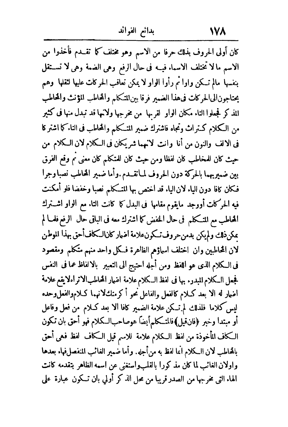 كان أولى الحروف بذلك حرفا من الاسم وهو مختلف كما تقدم فأخذوا من الاسم ما لا تختلف الأسماء فيه في حال الرفع وهي الضمة وهي لا تستقل بنفسها ما لم تكن واوا ثم رأوا الواو لا يمكن تعاقب الحركات عليها لثقلها وهم يحتاجون إلى الحركات في هذا الضمير فرقا بين المتكلم والمخاطب المؤنث والمخاطب المذكر فجعلوا التاء مكان الواو لقربها من مخرجها ولأنها قد تبدل منها في كثير من الكلام كتراث وتجاه فاشترك ضمير المتكلم والمخاطب في التاء كما اشتركا في الألف والنون من أنا وأنت لأنهما شريكان في الكلام لأن الكلام من حيث كان للمخاطب كان لفظا ومن حيث للمتكلم كان معنى ثم وقع الفرق بين ضميريهما بالحركة دون الحرف لما تقدم وأما ضمير المخاطب نصبا وجرا فكان كافا دون الياء لأن الياء قد اختص بها المتكلم نصبا وخفضا فو أمكنت فيه الحركات أو وجد ما يقوم مقامها في البدل كما كانت التاء مع الواو اشترك المخاطب مع المتكلم في حال الخفض كما اشترك معه في الباقي حال الرفع فلما لم يكن ذلك ولم يكن بد من حروف تكون علامة إضمار كان الكاف أحق بهذا الموطن لأن المخاطبين وإن اختلف أسماؤهم الظاهرة فكل واحد منهم متكلم ومقصوده في الكلام الذي هو اللفظ ومن أجله احتيج إلى التعبير بالألفاظ عما في النفس فجعل الكلام المبدوء بها في لفظ الكلام علامة إضمار المخاطب ألا تراه لا يقع علامة إضمار له إلا بعد كلام كالفعل والفاعل نحو: أكرمتك لأنهما كلام والفعل وحده ليس كلاما فلذلك لم تكن علامة الضمير كافا إلا بعد كلام من فعل وفاعل أو مبتدأ وخبر فإن قيل: فالمتكلم أيضا هو صاحب الكلام فهو أحق بأن تكون الكاف المأخوذة من لفظ الكلام علامة للاسم قيل: الكاف لفظ فهي أحق بالمخاطب لأن الكلام إنما لفظ به من أجله وأما ضمير الغائب المنفصل فهاء بعدها واو لأن الغائب لما كان مذكورا بالقلب واستغنى عن اسمه الظاهر بتقدمه كانت الهاء التي مخرجها من الصدر قريبا من محل الذكر أولى بأن تكون عبارة على