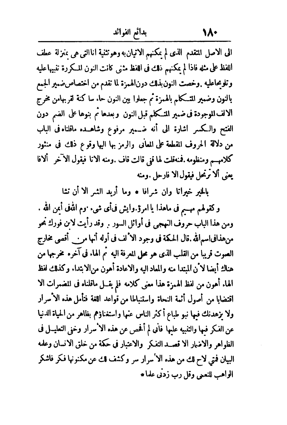 وكقولهم مهيم في ما هذا يا امرؤ وإيش في أي شيء وم الله في أيمن الله ومن هذا الباب حروف التهجي في أوائل السور وقد رأيت لابن فورك نحو من هذا في اسم الله قال الحكمة في وجود الألف في أوله أنها من أقصى مخارج الصوت قريبا من القلب الذي هو محل المعرفة إليه ثم الهاء في آخره مخرجها من هناك أيضا لأن المبتدأ منه والمعاد إليه والإعادة أهون من الابتداء وكذلك لفظ الهاء أهون من لفظ الهمزة هذا معنى كلامه فلم يقل ما قلناه في المضمرات إلا اقتضابا من أصول أئمة النحاة واستنباطا من قواعد اللغة فتأمل هذه الأسرار ولا يزهدنك فيها نبو طباع أكثر الناس عنها واستغناؤهم بظاهر من الحياة الدنيا عن الفكر والتنبيه عليها فإني لم أفحص عن هذه الأسرار وخفي التعليل في الظواهر والإضمار إلا قصد التفكر والإعتبار في حكمة من {خلق الإنسان علمه البيان} فمتى لاح لك من هذه الأسرار وكشف لك عن مكنونها فكر فاشكر الواهب للنعمى {قُلْ رَبِّ زِدْنِي عِلْماً}