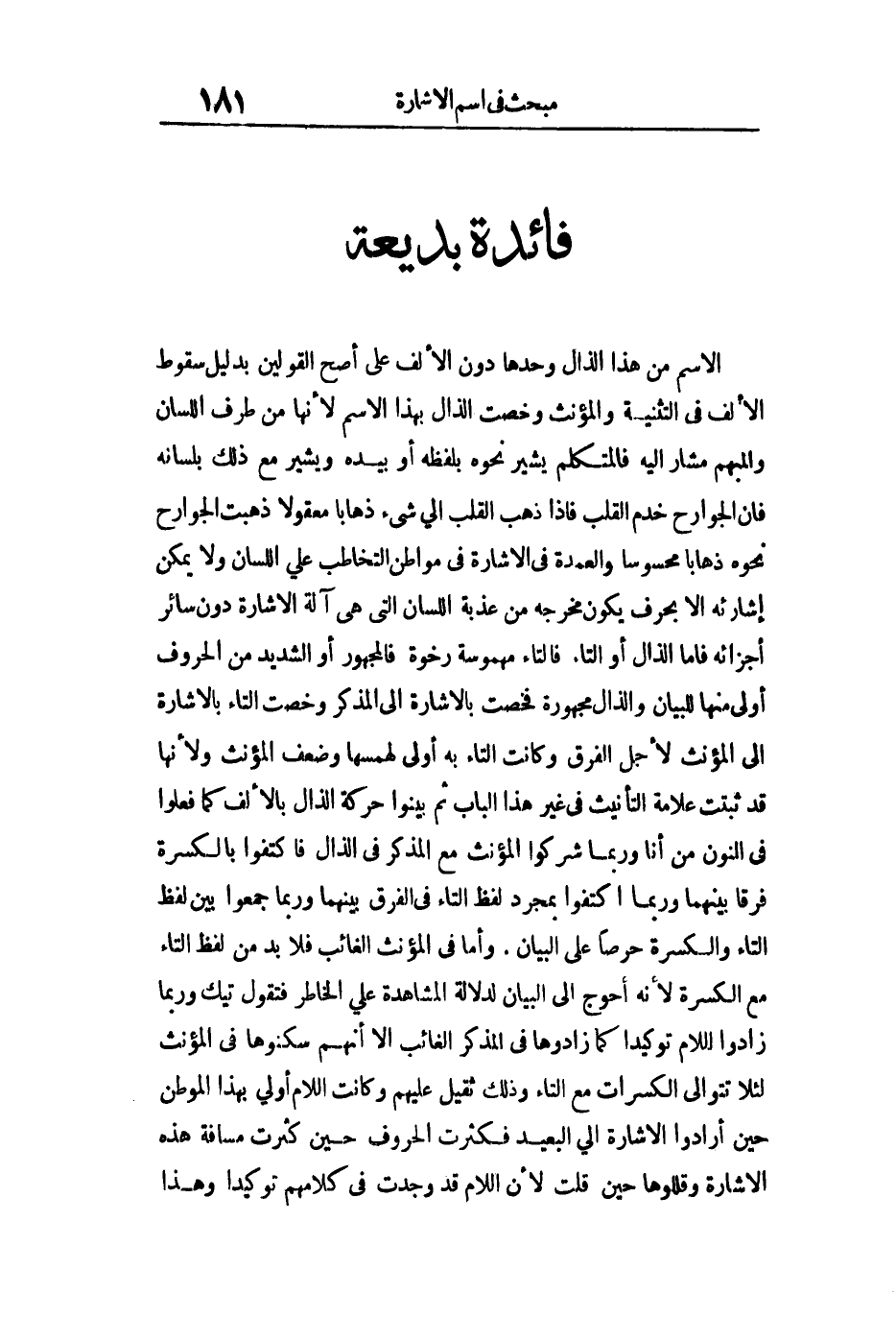 الاسم من هذا الذال وحدها دون الألف على أصح القولين بدليل سقوط الألف في التثنية والمؤنث وخصت الذال بهذا الاسم لأنها من طرف اللسان والمبهم مشار إليه فالمتكلم يشير نحوه بلفظه أو بيده ويشير مع ذلك بلسانه فإن الجوارح خدم القلب فإذا ذهب القلب إلى شيء ذهابا معقولا ذهبت الجوارح نحوه ذهابا محسوسا والعمدة في الإشارة في مواطن التخاطب على اللسان ولا يمكن إشارته إلا بحرف يكون مخرجه من عذبة اللسان التي هي آلة الإشارة دون سائر أجزائه فأما الذال أو التاء فالتاء مهموسة رخوة فالمجهور أو الشديد من الحروف أولى منها للبيان والذال مجهورة فخصت بالإشارة إلى المذكر وخصت التاء بالإشارة إلى المؤنث لأجل الفرق وكانت التاء به أولى لهمسها وضعف المؤنث ولأنها قد ثبتت علامة التأنيث في غير هذا الباب ثم بينوا حركة الذال بالألف كما فعلوا في النون من أنا وربما شركوا المؤنث مع المذكر في الذال فاكتفوا بالكسرة فرقا بينهما وربما اكتفوا بمجرد لفظ التاء في الفرق بينهما وربما جمعوا بين لفظ التاء والكسرة حرصا على البيان وأما في المؤنث الغائب فلا بد من لفظ التاء مع الكسرة لأنه أحوج إلى البيان لدلالة المشاهدة على الخاطر فتقول: تيك وربما زادوا اللام توكيدا كما زادوها في المذكر الغائب إلا أنهم سكنوها في المؤنث لئلا تتوالى الكسرات مع التاء وذلك ثقيل عليهم وكانت اللام أولى بهذا الموطن حين أرادوا الإشارة إلى البعيد فكثرت الحروف حين كثرت مسافة هذه الإشارة وقللوها حين قلت لأن اللام قد وجدت في كلامهم توكيدا وهذا