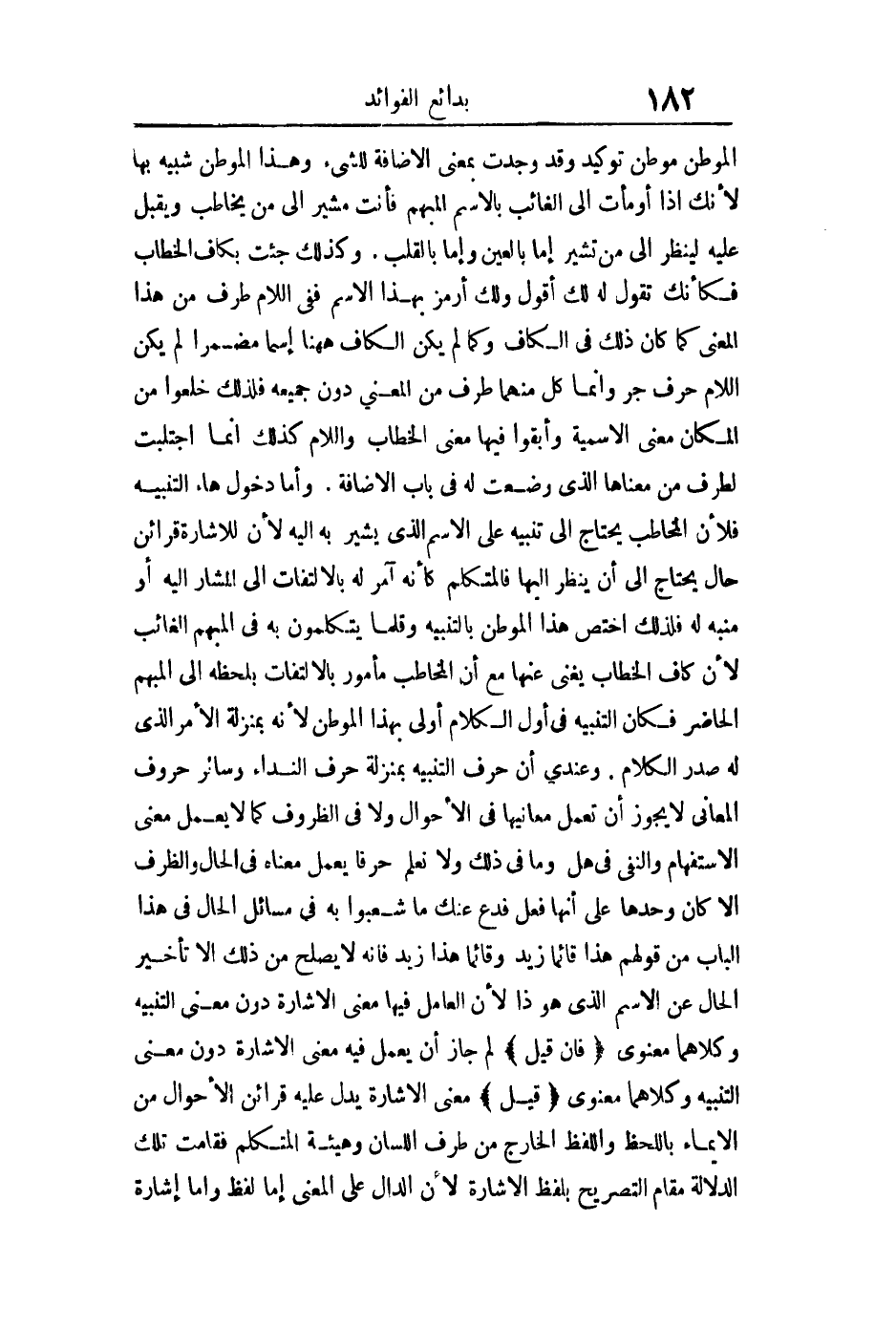 الموطن موطن توكيد وقد وجدت بمعنى الإضافة للشيء وهذا الموطن شبيه بها لأنك إذا أومأت إلى الغائب بالاسم المبهم فأنت مشير إلى من يخاطب ويقبل عليه لينظر إلى من تشير إما بالعين وإما بالقلب وكذلك جئت بكاف الخطاب فكأنك تقول له لك أقول ولك أرمز بهذا الاسم ففي اللام طرف من هذا المعنى كما كان ذلك في الكاف وكما لم يكن الكاف هاهنا اسما مضمرا لم يكن اللام حرف جر وإنما كل منهما طرف من المعنى دون جميعه فلذلك خلعوا من المكان معنى الاسمية وأبقوا فيها معنى الخطاب واللام كذلك إنما اجتلبت لطرف من معناها الذي وضعت له في باب الإضافة وأما دخول هاء التنبيه فلأن المخاطب يحتاج إلى تنبيه على الاسم الذي يشير به إليه لأن للإشارة قرائن حال يحتاج إلى أن ينظر إليها فالمتكلم كأنه آمر له بالالتفات إلى المشار إليه أو منبه له فلذلك اختص هذا الموطن بالتنبيه وقلما يتكلمون به في المبهم الغائب لأن كاف الخطاب يغني عنها مع أن المخاطب مأمور بالالتفات بلحظه إلى المبهم الحاضر فكان التنبيه في أول الكلام أولى بهذا الموطن لأنه بمنزلة الأمر الذي له صدر الكلام وعندي أن حرف التنبيه بمنزلة حرف النداء وسائر حروف المعاني لا يجوز أن تعمل معانيها في الأحوال ولا في الظروف كما لا يعمل معنى الاستفهام والنفي في هل وما في ذلك ولا نعلم حرفا يعمل معناه في الحال والظرف إلا كان وحدها على أنها فعل فدع عنك ما شعبوا به في مسائل الحال في هذا الباب من قولهم هذا قائما زيد وقائما هذا زيد فإنه لا يصلح من ذلك إلا تأخير الحال عن الاسم الذي هو ذا لأن العامل فيه معنى الإشارة دون معنى التنبيه وكلاهما معنوي فإن قيل: لم جاز أن يعمل فيه معنى الإشارة دون معنى التنبيه وكلاهما معنوي قيل: معنى الإشارة تدل عليه قرائن الأحوال من الإيماء باللحظ واللفظ الخارج من طرف اللسان وهيئة المتكلم فقامت تلك الدلالة مقام التصريح بلفظ الإشارة لأن الدال على المعنى إما لفظ وإما إشارة