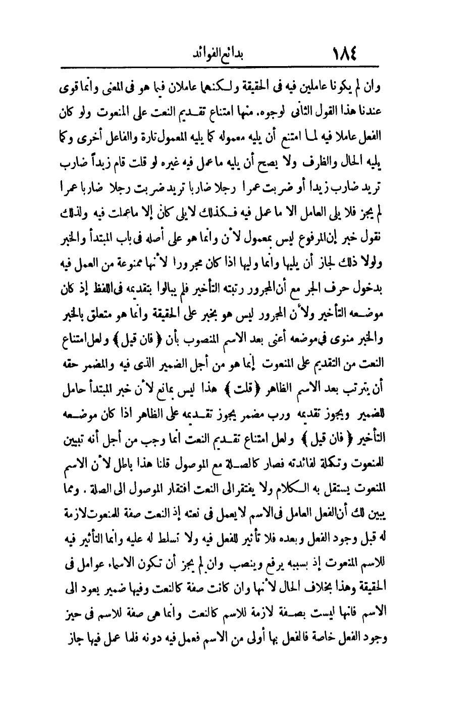 وإن لم يكونا عاملين فيه في الحقيقة ولكنهما عاملان فيما هو في المعنى وإنما قوي عندنا هذا القول الثاني لوجوه منها امتناع تقديم النعت على المنعوت ولو كان الفعل عاملا فيه لما امتنع أن يليه معموله كما يليه المعمول تارة والفاعل أخرى وكما يليه الحال والظرف ولا يصح أن يليه ما عمل فيه غيره لو قلت: قام زيدا ضاربا تريد ضارب زيدا أو ضربت عمرا رجلا ضاربا تريد ضربت رجلا ضاربا عمرا لم يجز فلا يلي العامل إلا ما عمل فيه فكذلك لا يلي كان إلا ما عملت فيه ولذلك نقول خبر إن المرفوع ليس بمعمول ل إن وإنما هو على أصله في باب المبتدأ والخبر ولولا ذلك لجاز أن يليها وإنما وليها إذا كان مجرورا لأنها ممنوعة من العمل فيه بدخول حرف الجر مع أن المجرور رتبته التأخير فلم يبالوا بتقديمه في اللفظ إذ كان موضعه التأخير ولأن المجرور ليس هو بخبر على الحقيقة وإنما هو متعلق بالخبر والخبر منوي في موضعه أعني بعد الاسم المنصوب بأن فإن قيل: ولعل امتناع النعت من التقديم على المنعوت إنما هو من أجل الضمير الذي فيه والمضمر حقه أن يترتب بعد الاسم الظاهر قلت: هذا ليس بمانع لأن خبر المبتدأ حامل للضمير ويجوز تقديمه ورب مضمر يجوز تقديمه على الظاهر إذا كان موضعه التأخير فإن قيل: ولعل امتناع تقديم النعت إنما وجب من أجل أنه تبيين للمنعوت وتكملة لفائدته فصار كالصلة مع الموصول قلنا هذا باطل لأن الاسم المنعوت يستقل به الكلام ولا يفتقر إلى النعت افتقار الموصول إلى الصلة ومما يبين لك أن الفعل العامل في الاسم لا يعمل في نعته إذ النعت صفة للمنعوت لازمة له قبل وجود الفعل وبعده فلا تأثير للفعل فيه ولا تسلط له عليه وإنما التأثير فيه للاسم المنعوت إذ بسببه يرفع وينصب وإن لم يجز أن تكون الأسماء عوامل في الحقيقة وهذا بخلاف الحال لأنها وإن كانت صفة كالنعت وفيها ضمير يعود إلى الاسم فإنها ليست بصفة لازمة للاسم كالنعت وإنما هي صفة للاسم في حيز وجود الفعل خاصة فالفعل بها الاسم من الاسم فعمل فيه دونه فلما عمل فيها جاز