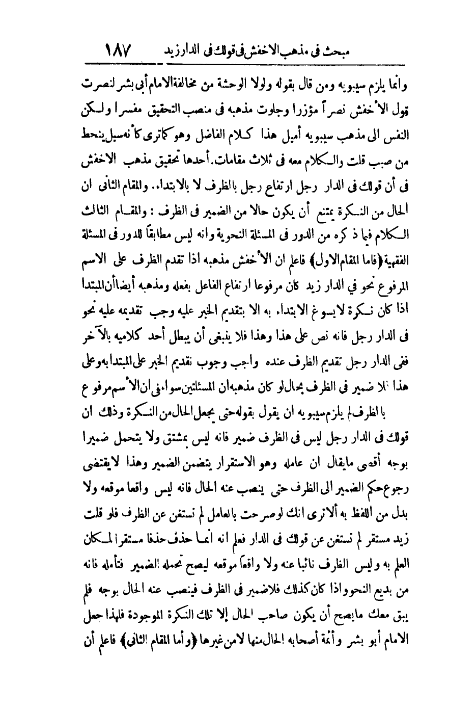 وإنما يلزمه سيبويه ومن قال بقوله: ولولا الوحشة من مخالفة الإمام أبي بشر لنصرت قول الأخفش نصرا مؤزرا وجلوت مذهبه في منصب التحقيق مفسرا ولكن النفس إلى مذهب سيبويه أميل هذا كلام الفاضل وهو كما ترى كأنه سيل ينحط من صبب قلت: والكلام معه في ثلاثة مقامات أحدها: تحقيق مذهب الأخفش في أن قولك في الدار رجل ارتفاع رجل بالظرف لا بالابتداء والمقام الثاني: أن الحال من النكرة يمتنع أن يكون حالا من الضمير في الظرف والمقام الثالث: الكلام فيما ذكره من الدور في المسألة النحوية وأنه ليس مطابقا للدور في المسألة الفقهية فأما المقام الأول: فاعلم أن الأخفش مذهبه إذا تقدم الظرف على الاسم المرفوع نحو في الدار زيد كان مرفوعا ارتفاع الفاعل بفعله ومذهبه أيضا أن المبتدأ إذا كان نكرة لا يسوغ الابتداء به إلا بتقديم الخبر عليه وجب تقديمه عليه نحو في الدار رجل فإنه نص على هذا وهذا فلا ينبغي أن يبطل أحد كلاميه بالآخر ف في الدار رجل تقديم الظرف عنده واجب وجوب تقديم الخبر على المبتدأ به وعلى هذا فلا ضمير في الظرف بحال لو كان مذهبه أن المسألتين سواء في أن الاسم مرفوع بالظرف لم يلزم سيبويه أن يقول بقوله حتى يجعل الحال من النكرة وذلك أن قولك في الدار رجل ليس في الظرف ضمير فإنه ليس بمشتق ولا يتحمل ضميرا بوجه أقصى ما يقال إن عامله وهو الاستقرار يتضمن الضمير وهذا لا يقتضي رجوع حكم الضمير إلى الظرف حتى ينصب عنه الحال فإنه ليس واقعا موقعه ولا بدل من اللفظ به ألا ترى أنك لو صرحت بالعامل لم تستغن عن الظرف فلو قلت زيد مستقر لم تستغن عن قولك في الدار فعلم أنه إنما حذف حذفا مستقرا لمكان العلم به وليس الظرف نائبا عنه ولا واقعا موقعه ليصح تحمله الضمير فتأمله فإنه من بديع النحو وإذا كان كذلك فلا ضمير في الظرف فينصب عنه الحال بوجه فلم يبق معك ما يصح أن يكون صاحب الحال إلا تلك النكرة الموجودة فلهذا جعل الإمام أبو بشر وأئمة أصحابه الحال منها لا من غيرها وأما المقام الثاني: فاعلم أن