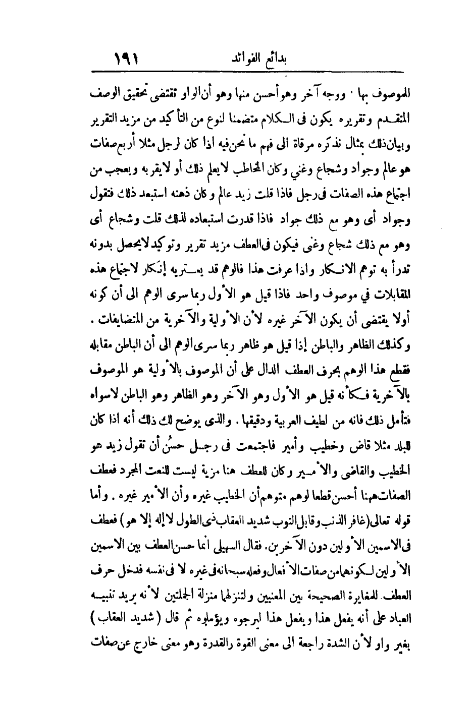 للموصوف بها ووجه آخر وهو أحسن منها وهو أن الواو تقتضي تحقيق الوصف المتقدم وتقريره يكون في الكلام متضمنا لنوع مع التأكيد من مزيد التقرير وبيان ذلك بمثال نذكره مرقاة إلى فهم ما نحن فيه إذا كان لرجل مثلا أربع صفات هي عالم وجواد وشجاع وغني وكان المخاطب لا يعلم ذلك أو لا يقر به ويعجب من اجتماع هذه الصفات في رجل فإذا قلت: زيد عالم وكان ذهنه استبعد ذلك فتقول وجواد أي وهو مع ذلك جواد فإذا قدرت استبعاده لذلك قلت وشجاع أي وهو مع ذلك شجاع وغني فيكون في العطف مزيد تقرير وتوكيد لا يحصل بدونه تدرأ به توهم الإنكار وإذا عرفت هذا فالوهم قد يعتريه إنكار لاجتماع هذه المقابلات في موصوف واحد فإذا قيل: هو الأول ربما سرى الوهم إلى أن كونه أولا يقتضي أن يكون الآخر غيره لأن الأولية والآخرية من المتضايفات وكذلك الظاهر والباطن إذا قيل هو ظاهر ربما سرى الوهم إلى أن الباطن مقابله فقطع هذا الوهم بحرف العطف الدال على أن الموصوف بالأولية هو الموصوف بالآخرية فكأنه قيل: هو الأول وهو الآخر وهو الظاهر وهو الباطن لا سواه فتأمل ذلك فإنه من لطيف العربية ودقيقها والذي يوضح لك ذلك أنه إذا كان للبلد مثلا قاض وخطيب وأمير فاجتمعت في رجل حسن أن تقول زيد هو الخطيب والقاضي والأمير وكان للعطف هنا مزية ليست للنعت المجرد فعطف الصفات هاهنا أحسن قطعا لوهم متوهم أن الخطيب غيره وأن الأمير غيره وأما قوله تعالى: {غَافِرِ الذَّنْبِ وَقَابِلِ التَّوْبِ شَدِيدِ الْعِقَابِ ذِي الطَّوْلِ لا إِلَهَ إِلاّ هُوَ} فعطف في الاسمين الأولين دون الآخرين فقال السهيلي: إنما حسن العطف بين الاسمين الأولين لكونهما من صفات الأفعال" وفعله سبحانه في غيره لا في نفسه فدخل حرف العطف للمغايرة الصحيحة بين المعنيين ولتنزلهما منزلة الجملتين لأنه يريد تنبيه العباد على أنه يفعل هذا ويفعل هذا ليرجوه ويؤملوه" ثم قال: {شَدِيدُ الْعِقَابِ} بغير واو لأن الشدة راجعة إلى معنى القوة والقدرة وهو معنى خارج عن صفات