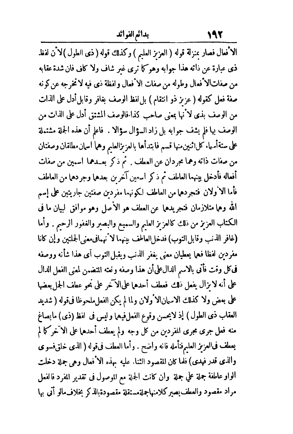 الأفعال فصار بمنزلة قوله: {الْعَزِيزِ الْعَلِيمِ} وكذلك قوله: {ذِي الطَّوْلِ} لأن لفظ ذي عبارة عن ذاته هذا جوابه وهو كما ترى غير شاف ولا كاف فإن شدة عقابه من صفات الأفعال وطوله من صفات الأفعال ولفظة ذي فيه لا تخرجه عن كونه صفة فعل كقوله: {عَزِيزٌ ذُو انْتِقَامٍ} بل لفظ الوصف بغافر وقابل أدل على الذات من الوصف ب ذي لأنها بمعنى صاحب كذا فالوصف المشتق أدل على الذات من الوصف بها فلم يشف جوابه بل زاد السؤال سؤالا فاعلم أن هذه الجملة مشتملة على ستة أسماء كل اثنين منها قسم فابتدأها بالعزيز العليم وهما اسمان مطلقان وصفتان من صفات ذاته وهما مجردان عن العطف ثم ذكر بعدهما اسمين من صفات أفعاله فأدخل بينهما العاطف ثم ذكر اسمين آخرين بعدهما وجردهما من العاطف فأما الأولان فتجردهما من العاطف لكونهما مفردين صفتين جاريتين على اسم الله وهما متلازمان فتجريدهما عن العطف هو الأصل وهو موافق لبيان ما في الكتاب العزيز من ذلك كالعزيز العليم والسميع البصير والغفور الرحيم وأما: {غَافِرِ الذَّنْبِ وَقَابِلِ التَّوْبِ} فدخل العاطف بينهما لأنهما في معنى الجملتين وإن كانا مفردين لفظا فهما يعطيان معنى يغفر الذنب ويقبل التوب أي هذا شأنه ووصفه في كل وقت فأتى بالاسم الدال على أن هذا وصفه ونعته المتضمن لمعنى الفعل الدال على أنه لا يزال يفعل ذلك فعطف أحدهما على الآخر على نحو عطف الجمل بعضها على بعض ولا كذلك الاسمان الأولان ولما لم يكن الفعل ملحوظا في قوله: {شَدِيدِ الْعِقَابِ ذِي الطَّوْلِ} إذ لا يحسن وقوع الفعل فيهما وليس في لفظ {ذِي} ما يصاغ منه فعل جرى مجرى المفردين من كل وجه ولم يعطف أحدهما على الآخر كما لم يعطف في العزيز العليم فتأمله فإنه واضح وأما العطف في قوله: {الَّذِي خَلَقَ فَسَوَّى وَالَّذِي قَدَّرَ فَهَدَى} فلما كان المقصود الثناء عليه بهذه الأفعال وهي جملة دخلت الواو عاطفة جملة على جملة وإن كانت الجملة مع الموصول في تقدير المفرد فالفعل مراد مقصود والعطف يصير كلا منها جملة مستقلة مقصودة بالذكر بخلاف ما لو أتى بها