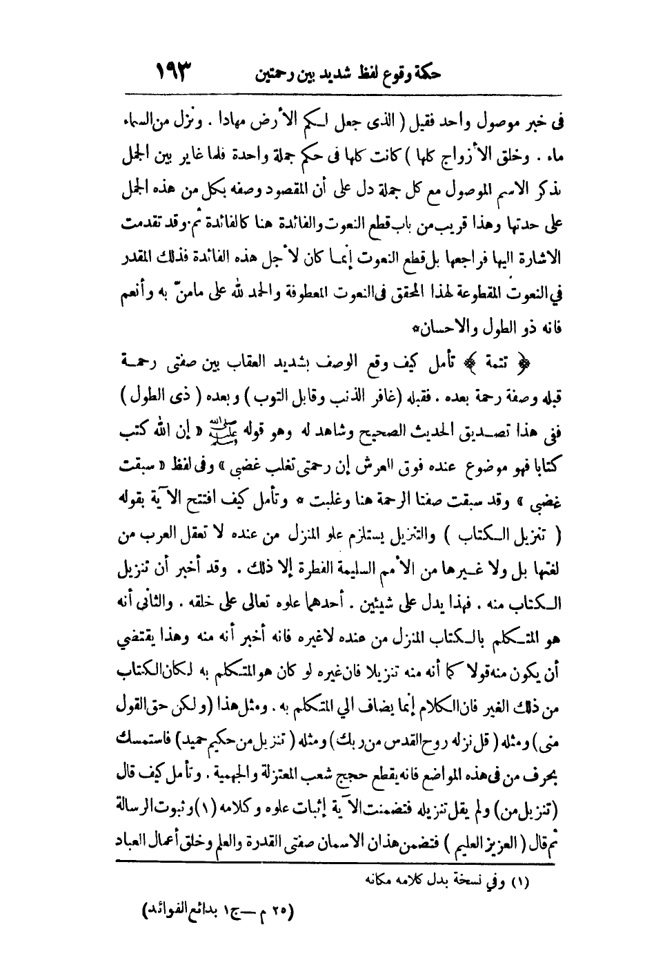 تتمة: تأمل كيف وقع الوصف بشديد العقاب بين صفة رحمة قبله وصفة رحمة بعده فقبله {غَافِرِ الذَّنْبِ وَقَابِلِ التَّوْبِ} وبعده {ذِي الطَّوْلِ} ففي هذا تصديق الحديث الصحيح وشاهد له وهو قوله صلى الله عليه وسلم: "إن الله كتب كتابا فهو موضوع عنده فوق العرش إن رحمتي تغلب غضبي" رواه البخاري ومسلم وفي لفظ": سبقت غضبي " وقد سبقت صفة الرحمة هنا وغلبت وتأمل كيف افتتح الآية بقوله: {تَنْزِيلُ الْكِتَابِ} والتنزيل يستلزم علو المنزل من عنده لا تعقل العرب من لغتها بل ولا غيرها من الأمم السليمة الفطرة إلا ذلك وقد أخبر أن تنزيل الكتاب منه فهذا يدل على شيئين أحدهما علوه تعالى على خلقه والثاني أنه هو المتكلم بالكتاب المنزل من عنده لا غيره فإنه أخبر أنه منه وهذا يقتضي أن يكون منه قولا كما أنه منه تنزيلا فإن غيره لو كان هو المتكلم به لكان الكتاب من ذلك الغير فإن الكلام فإنما يضاف إلى المتكلم به ومثل هذا {وَلَكِنْ حَقَّ الْقَوْلُ مِنِّي} ومثله: {قُلْ نَزَّلَهُ رُوحُ الْقُدُسِ مِنْ رَبِّكَ} ومثله: {تَنْزِيلٌ مِنْ حَكِيمٍ حَمِيدٍ} فاستمسك بحرف من في هذه المواضع فإنه يقطع حجج شعب المعتزلة والجهمية وتأمل كيف قال: {تَنْزِيلٌ مِنَ} ولم يقل تنزيله فتضمنت الآية إثبات علوه ومكانه وثبوت الرسالة ثم قال: {الْعَزِيزِ الْعَلِيمِ} فتضمن هذان الاسمان صفتي القدرة والعلم وخلق أعمال العباد