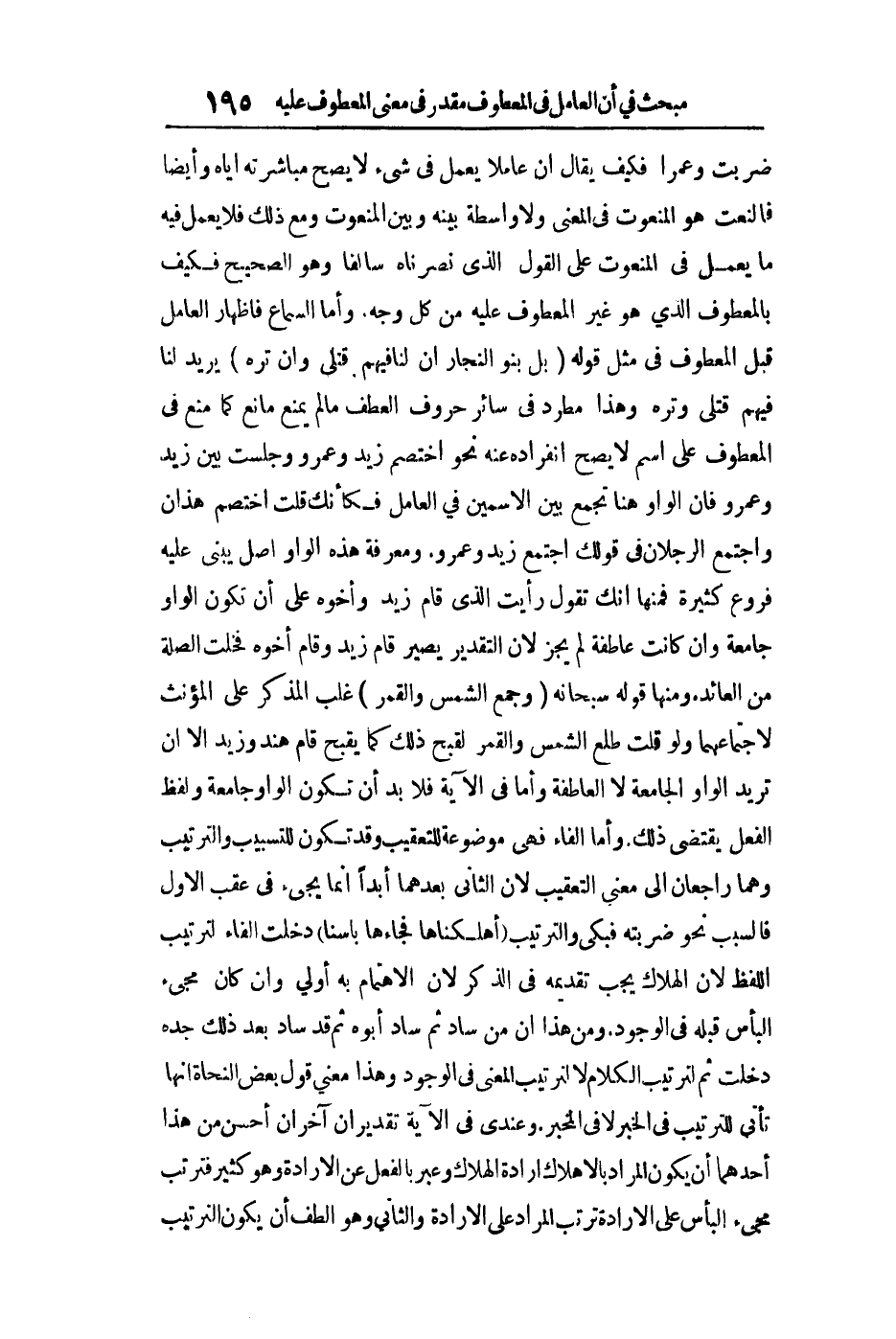 ضربت وعمرا فكيف يقال إن عاملا يعمل في شيء لا يصح مباشرته إياه وأيضا فالنعت هو المنعوت في المعنى ولا واسطة بينه وبين المنعوت ومع ذلك فلا يعمل فيه ما يعمل في المنعوت على القول الذي نصرناه سالفا وهو الصحيح فكيف بالمعطوف الذي هو غير المعطوف عليه من كل وجه وأما السماع فإظهار العامل قبل المعطوف في مثل قوله: "بل بنو النجار إن لنا فيهم قتلى وإن تره" يريد لنا فيهم قتلى وتره وهذا مطرد في سائر حروف العطف ما لم يمنع مانع كما منع في المعطوف على اسم لا يصح انفراده عنه نحو اختصم زيد وعمرو وجلست بين زيد وعمرو فإن الواو هنا تجمع بين الاسمين في العامل فكأنك قلت اختصم هذان واجتمع الرجلان في قولك اجتمع زيد وعمر الواو أصل تنبني عليه فروع ومعرفة هذه الواو أصل تنبني عليه فروع كثيرة فمنها أنك تقول رأيت الذي قام زيد وأخوه على أن تكون الواو جامعة وإن كانت عاطفة لم يجز لأن التقدير يصير قام زيد وقام أخوه فخلت الصلة من العائد ومنها قوله سبحانه: {وَجُمِعَ الشَّمْسُ وَالْقَمَرُ} غلب المذكر على المؤنث لاجتماعهما ولو قلت: طلع الشمس والقمر لقبح ذلك كما يقبح قام هند وزيد إلا أن تريد الواو الجامعة لا العاطفة وأما في الآية فلا بد أن تكون الواو جامعة ولفظ الفعل يقتضي ذلك وأما الفاء فهي موضوعة للتعقيب وقد تكون للتسبيب والترتيب وهما راجعان إلى معنى التعقيب لأن الثاني بعدهما أبدا إنما يجيء في عقب الأول فالسبب نحو ضربته فبكى والترتيب: {أَهْلَكْنَاهَا فَجَاءَهَا بَأْسُنَا} دخلت الفاء لترتيب اللفظ لأن الهلاك يجب تقديمه في الذكر لأن الاهتمام به أولى وإن كان مجيء البأس قبله في الوجود ومن هذا أن من ساد ثم ساد أبوه ثم قد ساد بعد ذلك جده دخلت ثم لترتيب الكلام لا لترتيب المعنى في الوجود وهذا معنى قول بعض النحاة: أنها تأتي للترتيب في الخبر لا في المخبر وعندي في الآية تقديران آخران أحسن من هذا أحدهما: أن يكون المراد بالإهلاك إرادة الهلاك وعبر بالفعل عن الإرادة وهو كثير فترتب مجيء البأس على الإرادة ترتب المراد على الإرادة والثاني وهو ألطف أن يكون الترتيب