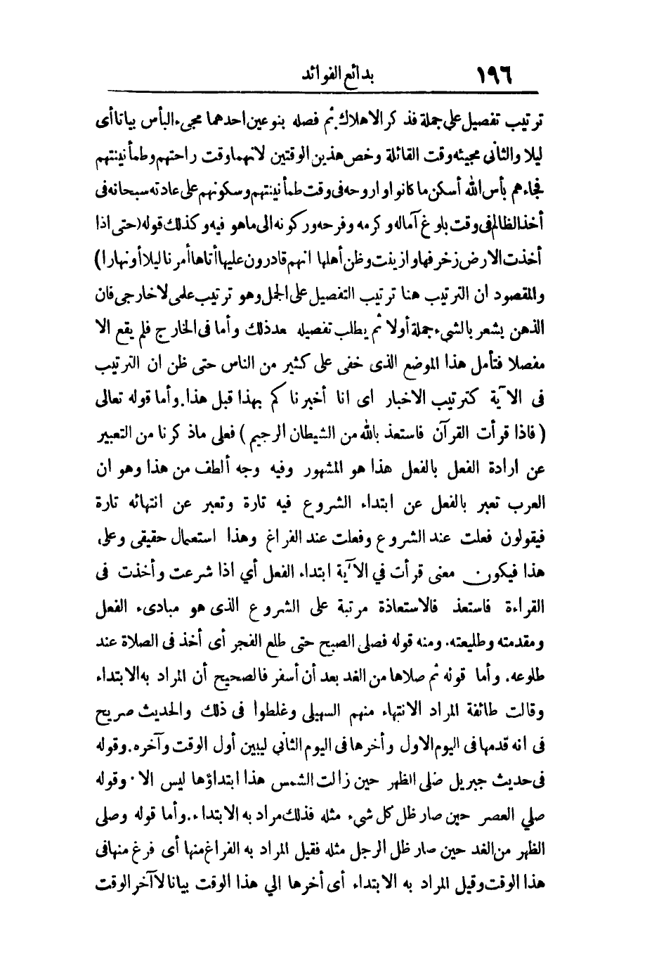 ترتيب تفصيل على جملة فذكر الإهلاك ثم فصله بنوعين أحدهما مجيء البأس بياتا أي ليلا والثاني مجيئه وقت القائلة وخص هذين الوقتين لأنهما وقت راحتهم وطمأنينتهم فجاءهم بأس الله أسكن ما كانوا وأروحه في وقت طمأنينتهم وسكونهم على عادته سبحانه في أخذ الظالم في وقت بلوغ آماله وكرمه وفرحه وركونه إلى ما هو فيه وكذلك قوله: {حَتَّى إِذَا أَخَذَتِ الأَرْضُ زُخْرُفَهَا وَازَّيَّنَتْ وَظَنَّ أَهْلُهَا أَنَّهُمْ قَادِرُونَ عَلَيْهَا أَتَاهَا أَمْرُنَا لَيْلاً أَوْ نَهَاراً} والمقصود أن الترتيب هنا ترتيب التفصيل على الجمل وهو ترتيب علمي لا خارجي فإن الذهن يشعر بالشيء جملة أولا ثم بطلب تفصيله بعد ذلك وأما في الخارج فلم يقع إلا مفصلا فتأمل هذا الموضع الذي خفي على كثير من الناس حتى ظن أن الترتيب في الآية كترتيب الإخبار أي إنا أخبرناكم بهذا قبل هذا وأما قوله تعالى: {فَإِذَا قَرَأْتَ الْقُرْآنَ فَاسْتَعِذْ بِاللَّهِ مِنَ الشَّيْطَانِ الرَّجِيمِ} فعلى ما ذكرنا من التعبير عن إرادة الفعل بالفعل هذا هو المشهور وفيه وجه ألطف من هذا وهو أن العرب تعبر بالفعل عن ابتداء الشروع فيه تارة وتعبر عن انتهائه تارة فيقولون فعلت عند الشروع وفعلت عند الفراغ وهذا استعمال حقيقي وعلى هذا فيكون معنى قرأت في الآية ابتداء الفعل أي إذا شرعت وأخذت في القراءة فاستعذ فالاستعاذة مرتبة على الشروع الذي هو مبادئ الفعل ومقدمته وطليعته ومنه قوله: "فصلى الصبح حتى طلع الفجر" رواه مسلم والترمذي والنسائي أي أخذ في الصلاة عند طلوعه وأما قوله: "ثم صلاها من الغد بعد أن أسفر " فالصحيح أن المراد به الابتداء وقالت طائفة: المراد الانتهاء منهم السهيلي: وغلطوا في ذلك والحديث صريح في أنه قدمها في اليوم الأول وأخرها في اليوم الثاني ليبين أول الوقت وآخره وقوله في حديث جبريل عليه السلام: "صلى الظهر حين زالت الشمس" هذا ابتداؤها ليس إلا وقوله عليه الصلاة والسلام: "صلى العصر حين صار ظل كل شيء مثله" فذلك مراد به الابتداء وأما قوله: " وصلى الظهر من الغد حين صار ظل الرجل " مثله فقيل المراد به الفراغ منها أي فرغ منها في هذا الوقت وقيل المراد به الابتداء أي أخرها إلى هذا الوقت بيانا لا آخر الوقت