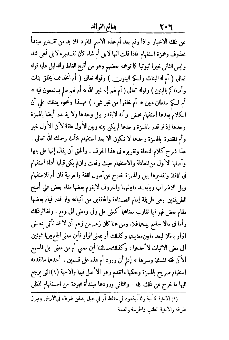 عن ذلك الإخبار وإذا وقع بعد أم هذه الاسم المفرد فلا بد من تقدير مبتدأ محذوف وهمزة استفهام فإذا قلت إنها لإبل أم شاء كان تقديره لإبل أهي شاء وليس الثاني خبرا ثبوتيا كما توهمه بعضهم وهو من أقبح الغلط والدليل عليه قوله تعالى: {أَمْ لَهُ الْبَنَاتُ وَلَكُمُ الْبَنُونَ} وقوله تعالى: {أَمِ اتَّخَذَ مِمَّا يَخْلُقُ بَنَاتٍ وَأَصْفَاكُمْ بِالْبَنِينَ} وقوله تعالى: {أَمْ لَهُمْ إِلَهٌ غَيْرُ اللَّهِ} {أَمْ لَهُمْ سُلَّمٌ يَسْتَمِعُونَ فِيهِ} {أَمْ لَكُمْ سُلْطَانٌ مُبِينٌ} {أَمْ خُلِقُوا مِنْ غَيْرِ شَيْءٍ} فهذا ونحوه يدلك على أن الكلام بعدها استفهام محض وأنه لا يقدر ب بل وحدها ولا يقدر أيضا ب الهمزة وحدها إذ لو قدر بالهمزة وحدها لم يكن بينه وبين الأول علاقة لأن الأول خبر وأم المقدرة بالهمزة وحدها لا تكون إلا بعد استفهام فتأمله رحمك الله تعالى هذا شرح كلام النحاة وتقريره في هذا الحرف والحق أن يقال إنها على بابها وأصلها الأول من المعادلة والاستفهام حيث وقعت وإن لم يكن قبلها أداة استفهام في اللفظ وتقديرها ب بل والهمزة خارج عن أصول اللغة العربية فإن أم للاستفهام وبل للإضراب ويا بعد ما بينهما والحروف لا يقوم بعضها مقام بعض على أصح الطريقتين وهي طريقة إمام الصناعة والمحققين من أتباعه ولو قدر قيام بعضها مقام بعض فهو فيما تقارب معناهما كمعنى على وفي ومعنى إلى ومع ونظائر ذلك وأما في مالا جامع بينهما فلا ومن هنا كان زعم من زعم أن لا قد تأتي بمعنى الواو باطلا لبعد ما بين معنييهما وكذلك أو بمعنى الواو فأين معنى الجمع بين الشيئين إلى معنى الإثبات لأحدهما وكذلك مسألتنا أين معنى أم من معنى بل فاسمع الآن فقه المسألة وسرها إعلم أن ورود أم هذه على قسمين أحدهما: ما تقدمه استفهام صريح بالهمزة وحكمها ما تقدم وهو الأصل فيها والأخية التي يرجع إليها ما خرج عن ذلك كله والثاني: ورودها مبتدأة مجردة من استفهام لفظي