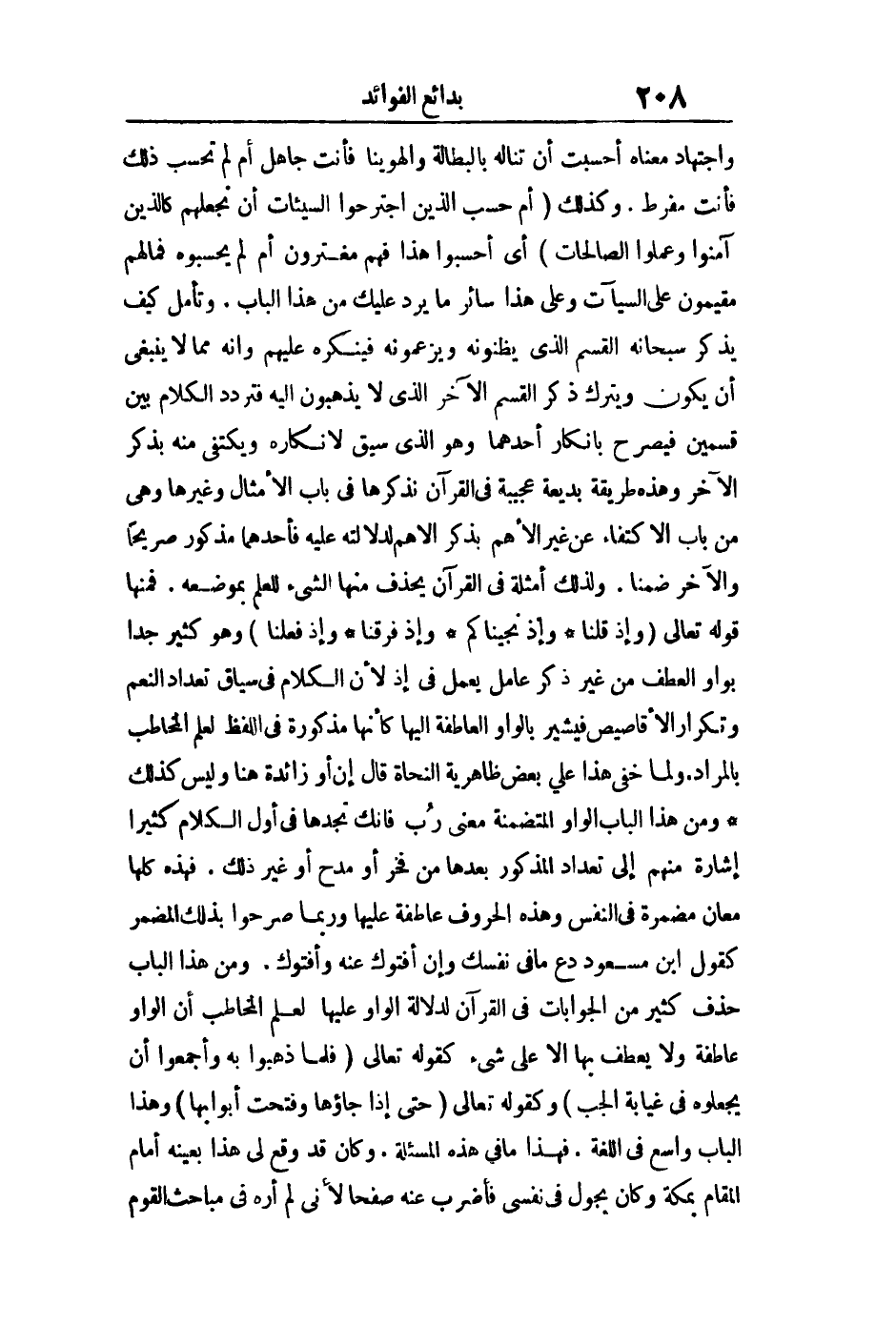 واجتهاد معناه أحسبت أن تناله بالبطالة والهوينا فأنت جاهل أم لم تحسب ذلك فأنت مفرط وكذلك: {أَمْ حَسِبَ الَّذِينَ اجْتَرَحُوا السَّيِّئَاتِ أَنْ نَجْعَلَهُمْ كَالَّذِينَ آمَنُوا وَعَمِلُوا الصَّالِحَاتِ} أي أحسبوا هذا فهم مغترون أم لم يحسبوه فما لهم مقيمون على السيئات وعلى هذا سائر ما يرد عليك من هذا الباب وتأمل كيف يذكر سبحانه القسم الذي يظنونه ويزعمونه فينكره عليهم وأنه مما لا ينبغي أن يكون ويترك ذكر القسم الآخر الذي لا يذهبون إليه فتردد الكلام بين قسمين فيصرح بإنكار أحدهما وهو الذي سيق لإنكاره ويكتفي منه بذكر الآخر وهذه طريقة بديعة عجيبة في القرآن نذكرها في باب الأمثال وغيرها وهي من باب الإكتفاء عن غير الأهم بذكر الأهم لدلالته عليه فأحدهما مذكور صريحا والآخر ضمنا ولذلك أمثلة في القرآن يحذف منها الشيء للعلم بموضعه فمنها قوله تعالى: {وَإِذْ قُلْنَا} {وَإِذْ نَجَّيْنَاكُمْ} {وَإِذْ فَرَقْنَا} وهو كثير جدا بواو العطف من غير ذكر عامل يعمل في إذ لأن الكلام في سياق تعداد النعم وتكرار الأقاصيص فيشير بالواو العاطفة إليها كأنها مذكورة في اللفظ لعلم المخاطب بالمراد ولما خفي هذا على بعض ظاهرية النحاة قال إن أو زائدة هنا وليس كذلك ومن هذا الباب الواو المتضمنة معنى رب فإنك تجدها في أول الكلام كثيرا إشارة منهم إلى تعداد المذكور بعدها من فخر أو مدح أو غير ذلك فهذه كلها معان مضمرة في النفس وهذه الحروف عاطفة عليها وربما صرحوا بذلك المضمر كقول ابن مسعود: "دع ما في نفسك وإن أفتوك عنه وأفتوك" ومن هذا الباب حذف كثير من الأجوبة في القرآن لدلالة الواو عليها لعلم المخاطب أن الواو عاطفة ولا يعطف بها إلا على شيء كقوله تعالى: {فَلَمَّا ذَهَبُوا بِهِ وَأَجْمَعُوا أَنْ يَجْعَلُوهُ فِي غَيَابَتِ الْجُبِّ} وكقوله تعالى: {حَتَّى إِذَا جَاءُوهَا فُتِحَتْ أَبْوَابُهَا} وهذا الباب واسع في اللغة فهذا ما في هذه المسألة وكان قد وقع لي هذا بعينه أمام المقام بمكة وكان يجول في نفسي فأضرب عنه صفحا لأني لم أره في مباحث القوم