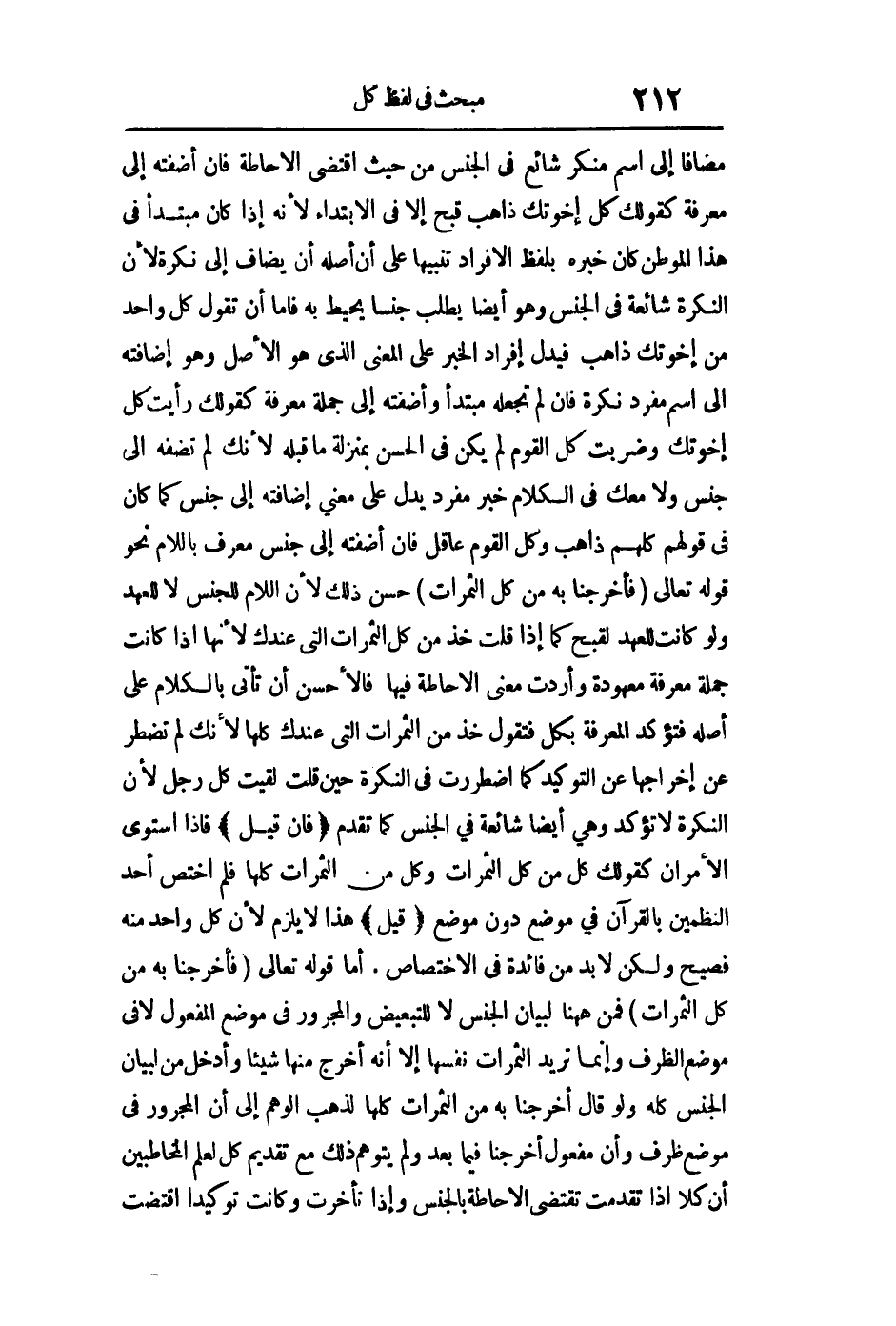 إلى اسم منكر شائع في الجنس من حيث اقتضى الإحاطة فإن أضفته إلى معرفة كقولك كل إخوتك ذاهب قبح إلا في الابتداء لأنه إذا كان مبتدأ في هذا الموطن كان خبره بلفظ الإفراد تنبيها على أن أصله أن يضاف إلى نكرة لأن النكرة شائعة في الجنس وهو أيضا يطلب جنسا يحيط به فإما أن تقول كل واحد من إخوتك ذاهب فيدل إفراد الخبر على المعنى الذي هو الأصل وهو إضافته إلى اسم مفرد نكرة فإن لم تجعله مبتدأ وأضفته إلى جملة معرفة كقولك رأيت كل إخوتك وضربت كل القوم لم يكن في الحسن بمنزلة ما قبله لأنك لم تضفه إلى جنس ولا معك في الكلام خبر مفرد يدل على معنى إضافته إلى جنس كما كان في قولهم كلهم ذاهب وكل القوم عاقل فإن أضفته إلى جنس معرف باللام نحو قوله تعالى: {فَأَخْرَجْنَا بِهِ مِنْ كُلِّ الثَّمَرَاتِ} حسن ذلك لأن اللام للجنس لا للعهد ولو كانت للعهد لقبح كما إذا قلت خذ من كل الثمرات التي عندك لأنها إذا كانت جملة معرفة معهودة وأردت معنى الإحاطة فيها فالأحسن أن تأتي بالكلام على أصله فتؤكد المعرفة ب كل فتقول خذ من الثمرات التي عندك كلها لأنك لم تضطر عن إخراجها عن التوكيد كما اضطررت في النكرة حين قلت لقيت كل رجل لأن النكرة لا تؤكد وهي أيضا شائعة في الجنس كما تقدم فإن قيل: فإذا استوى الأمران كقولك كل من كل الثمرات وكل من الثمرات كلها فلم اختص أحد النظمين بالقرآن في موضع دون موضع قيل: هذا لا يلزم لأن كل واحد منه فصيح ولكن لا بد من فائدة في الاختصاص أما قوله تعالى: {فَأَخْرَجْنَا بِهِ مِنْ كُلِّ الثَّمَرَاتِ} فمن هاهنا لبيان الجنس لا للتبعيض والمجرور في موضع المفعول لا في موضع الظرف وإنما تريد الثمرات نفسها إلا أنه أخرج منها شيئا وأدخل من لبيان الجنس كله ولو قال أخرجنا به من الثمرات كلها لذهب الوهم إلى أن المجرور في موضع ظرف وأن مفعول أخرجنا فيما بعد ولم يتوهم ذلك مع تقديم كل لعلم المخاطبين أن كلا إذا تقدمت تقتضي الإحاطة بالجنس وإذا تأخرت وكانت توكيدا اقتضت