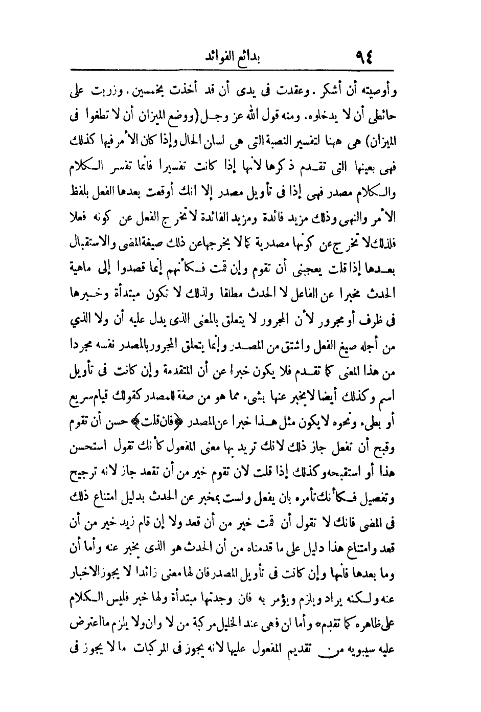 وأوصيته أن اشكر وعقدت في يدي أن قد أخذت بخمسين وزريت على حائطي أن لا يدخلوه ومنه قول الله عز وجل: {وَوَضَعَ الْمِيزَانَ أَلا تَطْغَوْا فِي الْمِيزَانِ} هي هاهنا لتفسير النصبة التي هي لسان الحال وإذا كان الأمر فيها كذلك فهي بعينها التي تقدم ذكرها لأنها إذا كانت تفسيرا فإنما تفسر الكلام والكلام مصدر فهي إذا في تأويل مصدر إلا أنك أوقعت بعدها الفعل بلفظ الأمر والنهي وذلك مزيد فائدة ومزيد الفائدة لا تخرج الفعل عن كونه فعلا فلذلك لا تخرج عن كونها مصدرية كما لا يخرجها عن ذلك صيغة المضي والاستقبال بعدها إذا قلت يعجبني أن تقوم وأن قمت فكأنهم إنما قصدوا إلى ماهية الحدث مخبرا عن الفاعل لا الحدث مطلقا ولذلك لا تكون مبتدأة وخبرها في ظرف أو مجرور لأن المجرور لا يتعلق بالمعنى الذي يدل عليه أن ولا الذي من أجله صيغ الفعل واشتق من المصدر وإنما يتعلق المجرور بالمصدر نفسه مجردا من هذا المعنى كما تقدم فلا يكون خبرا عن أن المتقدمة وإن كانت في تأويل اسم وكذلك أيضا لا يخبر عنها بشيء مما هو من صفة للمصدر كقولك قيام سريع أو بطيء ونحوه لا يكون مثل هذا خبرا عن المصدر فإن قلت: حسن أن تقوم وقبح أن تفعل جاز ذلك لأنك تريد بها معنى المفعول كأنك تقول أستحسن هذا أو أستقبحه وكذلك إذا قلت لأن تقوم خير من أن تقعد جاز لأنه ترجيح وتفصيل فكأنك تأمره بأن يفعل ولست بمخبر عن الحدث بدليل امتناع ذلك في المضي فإنك لا تقول إن قمت خير من أن قعد ولا إن قام زيد خير من أن قعد وامتناع هذا دليل على ما قدمناه من أن الحدث هو الذي يخبر عنه وأما أن وما بعدها فإنها وإن كانت في تأويل المصدر فإن لها معنى زائدا ولا يجوز الإخبار عنه ولكنه يراد ويلزم يؤمر به فإن وجدتها مبتدأة ولها خبر فليس الكلام على ظاهره كما تقدم تركيب لن وأما لن فهي عند الخليل مركبة من لا ولن ولا يلزم ما اعترض عليه سيبويه من تقديم المفعول عليها لأنه يجوز في المركبات ما لا يجوز في