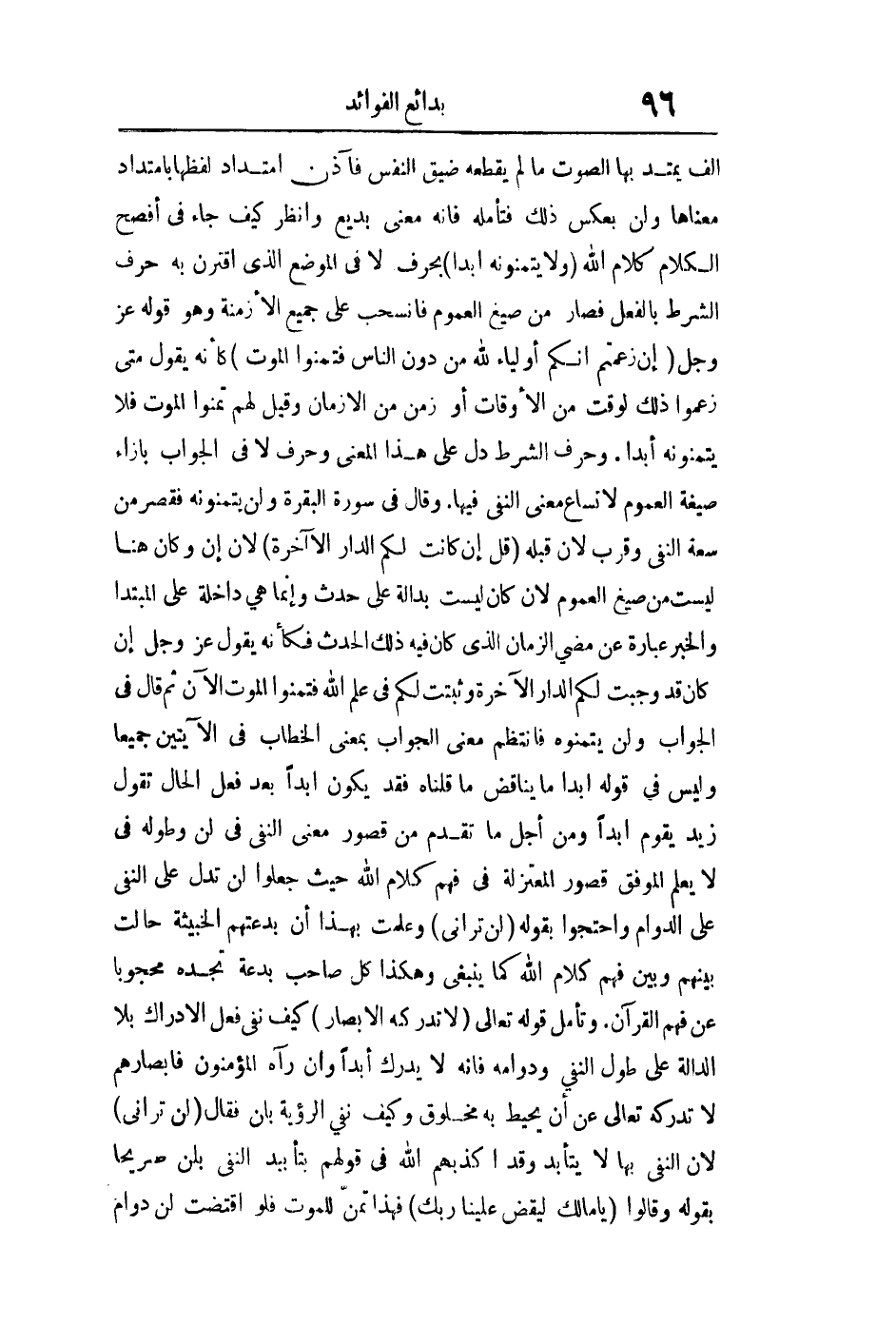 ألفا يمتد بها الصوت ما لم يقطعه ضيق النفس فآذن امتداد لفظها بامتداد معناها ولن يعكس ذلك فتأمله فإنه معنى بديع وانظر كيف جاء في أفصح الكلام كلام الله: {وَلا يَتَمَنَّوْنَهُ أَبَداً} بحرف لا في الموضع الذي اقترن به حرف الشرط بالفعل فصار من صيغ العموم فانسحب على جميع الأزمنة وهو قوله عز وجل: {إِنْ زَعَمْتُمْ أَنَّكُمْ أَوْلِيَاءُ لِلَّهِ مِنْ دُونِ النَّاسِ فَتَمَنَّوُا الْمَوْتَ} كأنه يقول: متى زعموا ذلك لوقت من الأوقات أو زمن من الأزمان وقيل لهم: تمنوا الموت فلا يتمنونه أبدا وحرف الشرط دل على هذا المعنى وحرف لا في الجواب بإزاء صيغة العموم لاتساع معنى النفي فيها وقال في سورة البقرة ولن يتمنونه فقصر من سعة النفي وقرب لأن قبله: {قُلْ إِنْ كَانَتْ لَكُمُ الدَّارُ الآخِرَةُ} لأن إن وكان هنا ليست من صيغ العموم لأن كان ليست بدالة على حدث وإنما هي داخلة على المبتدأ والخبر عبارة عن مضي الزمان الذي كان فيه ذلك الحدث فكأنه يقول عز وجل إن كان قد وجبت لكم الدار الآخرة وثبتت لكم في علم الله فتمنوا الموت الآن ثم قال في الجواب: ولن يتمنوه فانتظم معنى الجواب بمعنى الخطاب في الآيتين جميعا وليس في قوله: أبدا ما يناقض ما قلناه فقد يكون أبدا بعد فعل الحال تقول زيد يقوم أبدا قصور المعتزلة في فهم كلام الله ومن أجل ما تقدم من قصور معنى النفي في لن وطوله في لا يعلم الموفق قصور المعتزلة في فهم كلام الله تعالى حيث جعلوا لن تدل على النفي على الدوام واحتجوا بقوله: {لَنْ تَرَانِي} وعلمت بهذا أن بدعتهم الخبيثة حالت بينهم وبين فهم كلام الله كما ينبغي وهكذا كل صاحب بدعة تجده محجوبا عن فهم القرآن وتأمل قوله تعالى: {لا تُدْرِكُهُ الأَبْصَارُ} كيف نفى فعل الإدراك ب لا الدالة على طول النفي ودوامه فإنه لا يدرك أبدا وإن رآه المؤمنون فأبصارهم لا تدركه تعالى عن أن يحيط به مخلوق وكيف نفى الرؤية ب لن فقال: {لَنْ تَرَانِي} لأن النفي بها لا يتأبد وقد كذبهم الله في قولهم بتأبيد النفي ب لن بقوله وقالوا: يا مالك {لِيَقْضِ عَلَيْنَا رَبُّكَ} فهذا تمن للموت فلو اقتضت لن دوام
