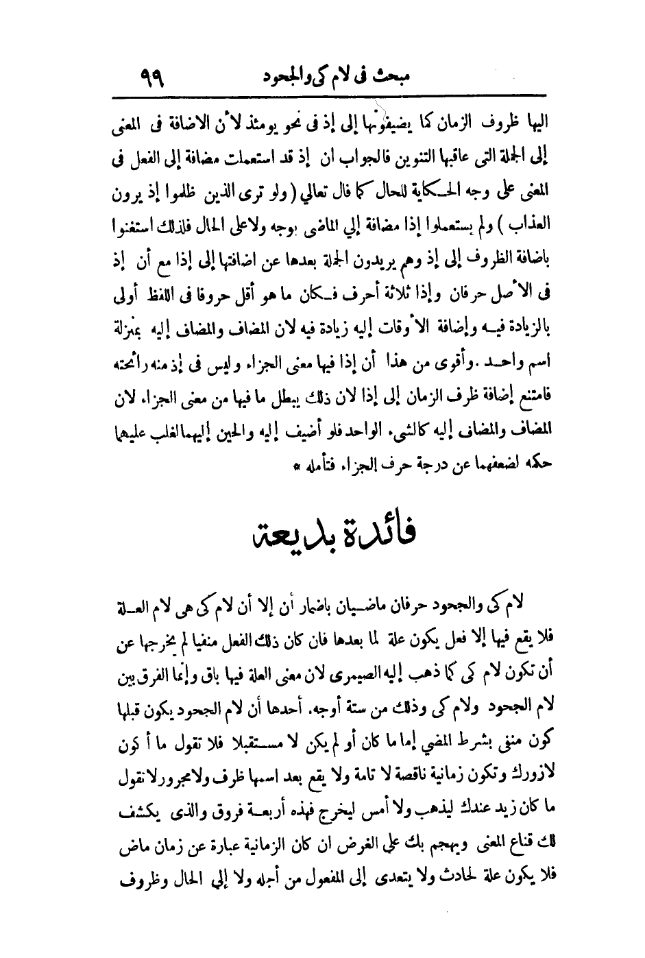 لام كي والجحود حرفان ماضيان بإضمار أن إلا أن لام كي هي لام العلة فلا يقع فيها إلا فعل يكون علة لما بعدها فإن كان ذلك الفعل منفيا لم يخرجها عن أن تكون لام كي كما ذهب إليه الصيمري لأن معنى العلة فيها باق وإنما الفرق بين لام الجحود ولام كي وذلك من ستة أوجه أحدها: أن لام الجحود يكون قبلها كون منفي بشرط المضي إما ما كان أو لم يكن لا مستقبلا فلا تقول ما أكون لأزورك وتكون زمانية ناقصة لا تامة ولا يقع بعد اسمها ظرف ولا مجرور لا تقول ما كان زيد عندك ليذهب ولا أمس ليخرج فهذه أربعة فروق والذي يكشف لك قناع المعنى ويهجم بك على الغرض أن كان الزمانية عبارة عن زمان ماض فلا يكون علة لحادث ولا يتعدى إلى المفعول من أجله ولا إلى الحال وظروف