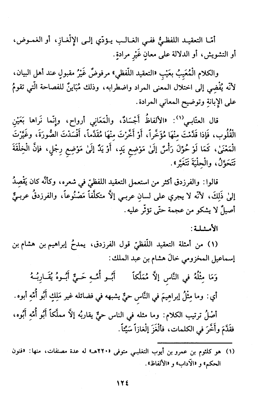 (1) من أمثلة التعقيد اللّفظيّ قول الفرزدق، يمدحُ إبراهيم بن هشام بن إسماعيل المخزومي خالَ هشام بن عبد الملك: