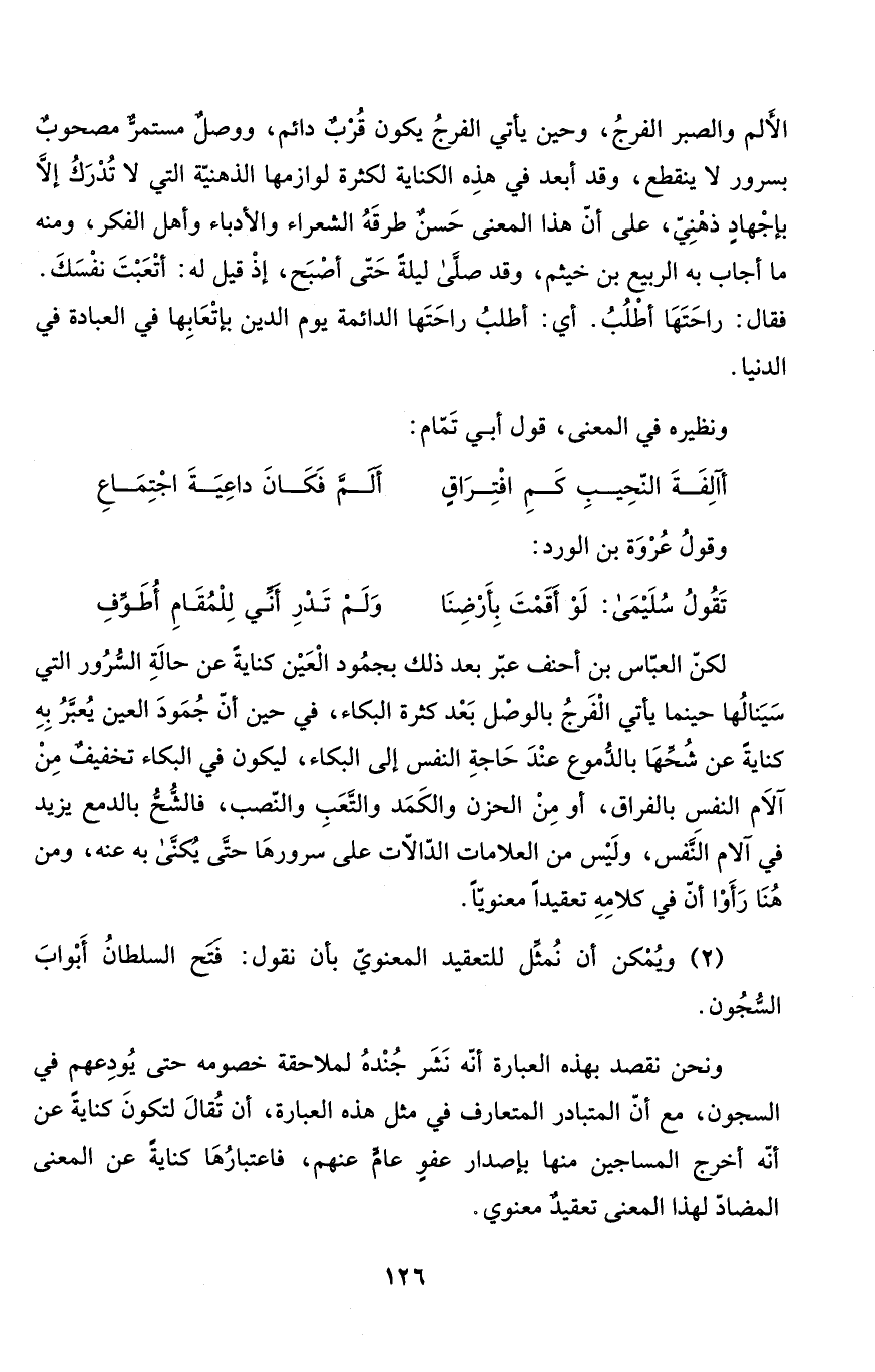 لكنّ العبّاس بن أحنف عبّر بعد ذلك بجمُود الْعَيْن كنايةً عن حالَةِ السُّرُور التي سَيَنالُها حينما يأتي الْفَرجُ بالوصْل بَعْد كثرة البكاء، في حين أنّ جُمَودَ العين يُعبَّرُ بِهِ كنايةً عن شُحِّهَا بالدُّموع عنْدَ حَاجةِ النفس إلى البكاء، ليكون في البكاء تخفيفٌ مِنْ آلاَم النفس بالفراق، أو مِنْ الحزن والكَمَد والتَّعَبِ والنّصب، فالشُّحُّ بالدمع يزيد في آلام النَّفس، ولَيْس من العلامات الدّالاّت على سرورهَا حتَّى يُكنَّى به عنه، ومن هُنا رَأَوْا أنّ في كلامِهِ تعقيداً معنويّاً.