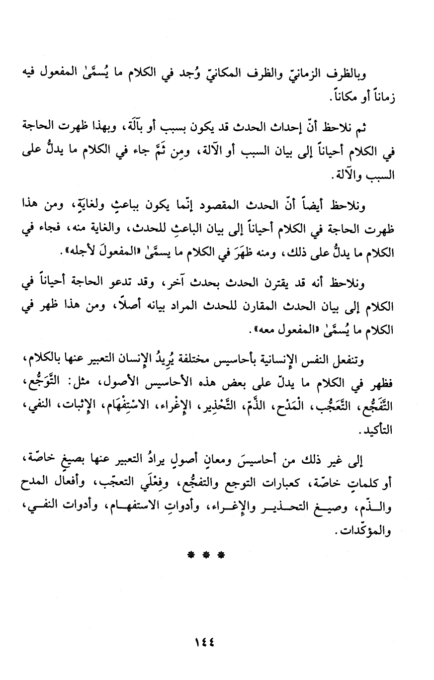 إلى غير ذلك من أحاسيسَ ومعانٍ أصولٍ يرادُ التعبير عنها بصيغٍ خاصّة، أو كلماتٍ خاصّة، كعبارات التوجع والتفجُّع، وفِعْلَي التعجّب، وأفعال المدح والذّم، وصيغ التحذير والإِغراء، وأدواتِ الاستفهام، وأدوات النفي، والمؤكّدات.