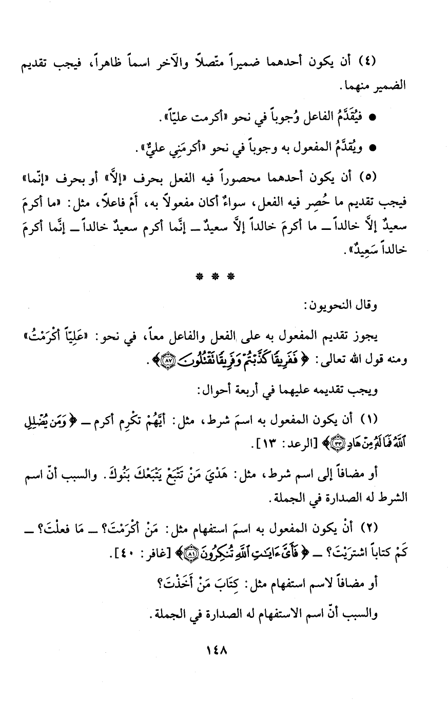 (1) أن يكون المفعول به اسمَ شرط، مثل: أيَّهُمْ تكْرِم أكرم - {وَمَن يُضْلِلِ الله فَمَا لَهُ مِنْ هَادٍ} [الرعد: 33] .
