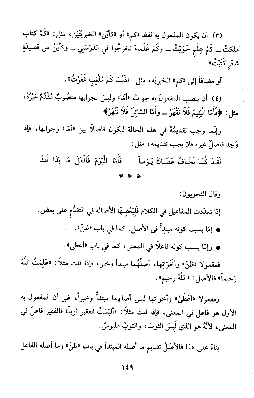 (3) أن يكون المفعول به لفظ "كم" أو "كأيّن" الخبريَّتَيْن، مثل: "كَمْ كتاب ملكتُ - كَمْ عِلْمٍ حَوَيْتُ - وكَمْ عُلَماءَ تخرجُوا في مَدْرَسَتِي - وكأيّنْ من قصيدَةِ شعْرٍ كَتَبْتُ".