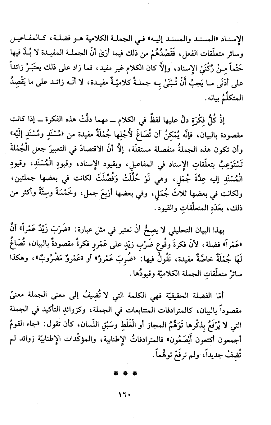 بهذا البيان التحليلي لا يصِحُّ أنْ نعتبر في مثل عبارة: "ضَرَبَ زَيْدٌ عَمْراً" أنَّ "عَمْراً" فضلة، لأنّ فكرةَ وقُوع ضَرْبِ زيْدٍ على عَمْروٍ فكرةٌ مقصودةٌ بالبيان، تُصَاغُ لَهَا جُمْلَةٌ خاصَّةٌ مفيدة، نَقُولُ فيها: "ضُرِبَ عَمْروٌ" أو "عَمْروٌ مَضْرُوبٌ"، وهكذا سائرُ متعلّقاتِ الجملة الكلاميّة وقيودُها.
