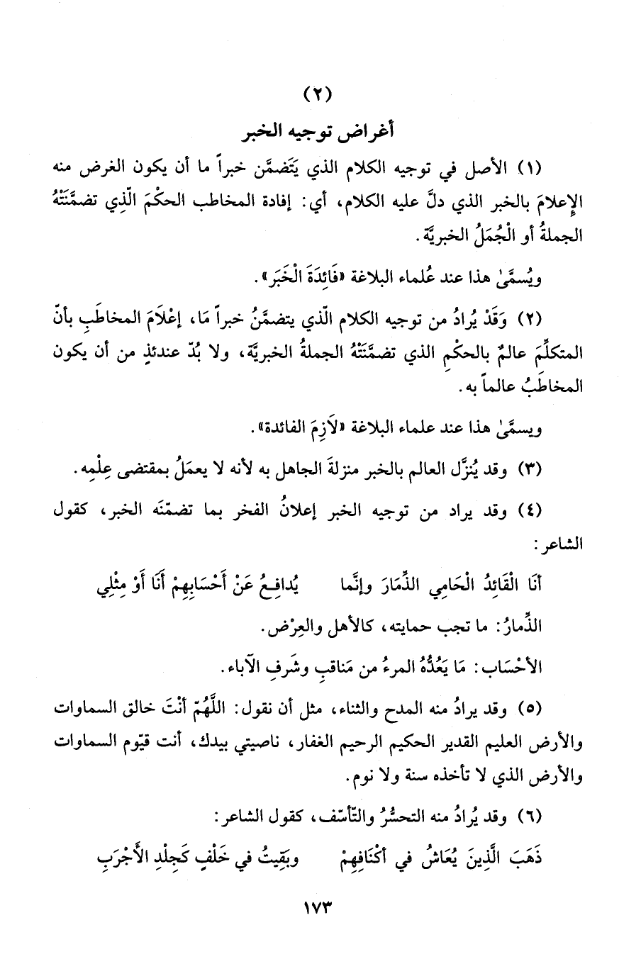 (2) وَقَدْ يُرادُ من توجيه الكلام الّذي يتضمَّنُ خبراً مَا، إعْلاَمَ المخاطَبِ بأنّ المتكلِّمَ عالمٌ بالحكْمِ الذي تضمَّنَتْهُ الجملةُ الخبريَّة، ولا بُدّ عندئذٍ من أن يكون المخاطَبُ عالماً به.