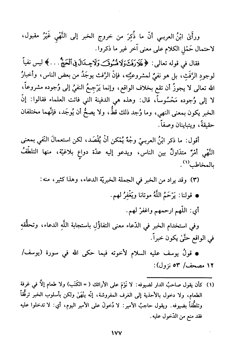 فقال في قوله تعالى: {فَلاَ رَفَثَ وَلاَ فُسُوقَ وَلاَ جِدَالَ فِي الحج ... } ليس نفياً لوجودِ الرَّفَثِ، بل هو نفيٌّ لمشروعيَّتِه، فإّن الرَّفث يوجَدُ من بعض الناس، وأخبارُ الله تعالى لا يجوزُ أن تقع بخلاف الواقع، وإنما يَرْجِعُ النفيُ إلى وُجوده مشروعاً، لا إلى وُجوده مَحْسُوساً، قال: وهذه هي الدفينة التي فاتت العلماء فقالوا: إنّ الخبر يكون بمعنى النهي، وما وُجد ذلك قطُّ، ولا يصحُّ أن يُوجَد، فإنَّهما مختلفات حقيقةً، ويتباينان وصفاً.