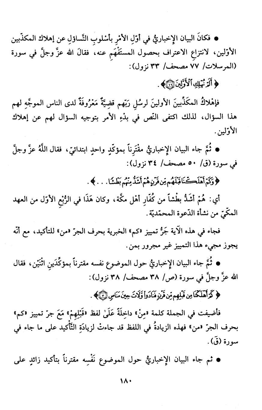 * فكانَ البيان الإِخباريُّ في أوّلِ الأمْرِ بأسْلوبِ التَّساؤلِ عن إهلاك المكذّبين الأوّلين، لانتزاعِ الاعتراف بحصول المستَفْهَمِ عنه، فقالَ الله عزَّ جلَّ في سورة (المرسلات/ 77 مصحف/ 33 نزول) :