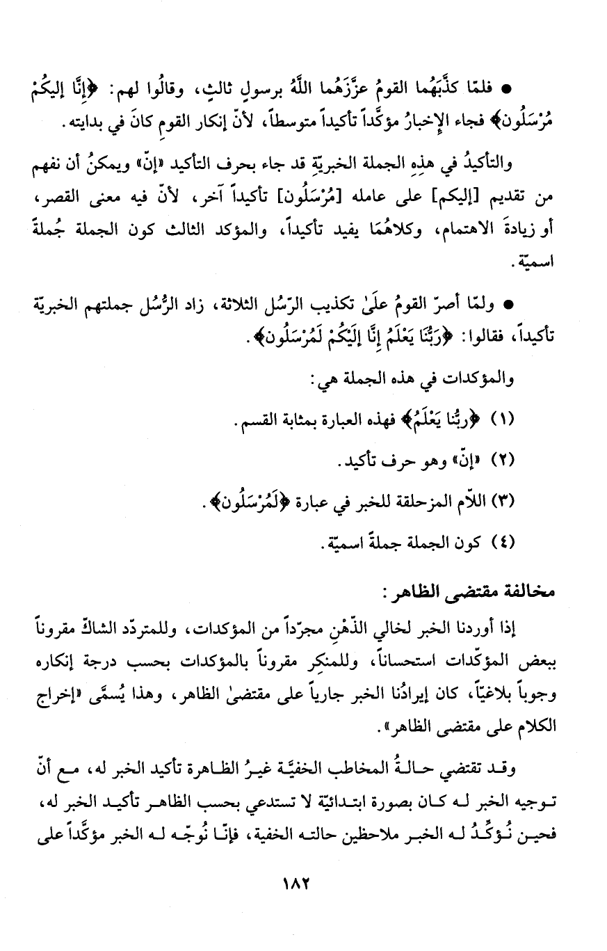 والتأكيدُ في هذِهِ الجملة الخبريّةِ قد جاء بحرف التأكيد "إنّ" ويمكنُ أن نفهم من تقديم [إليكم] على عامله [مُرْسَلُون] تأكيداً آخر، لأنّ فيه معنى القصر، أو زيادةَ الاهتمام، وكلاهُمَا يفيد تأكيداً، والمؤكد الثالث كون الجملة جُملةً اسميّة.