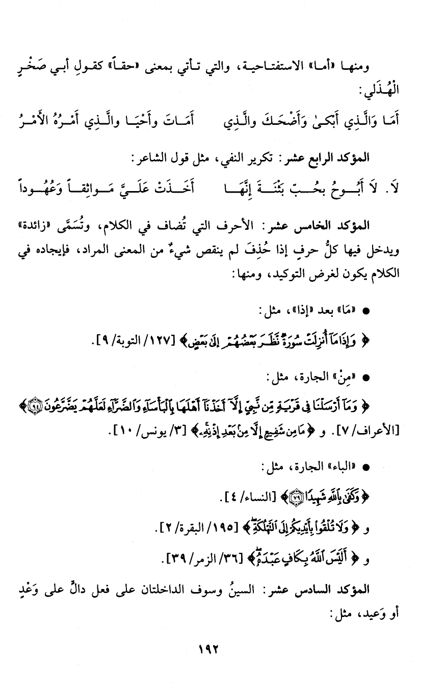 * المؤكد الخامس عشر: الأحرف التي تُضاف في الكلام، وتُسَمَّى "زائدة" ويدخل فيها كلُّ حرفٍ إذا حُذِفَ لم ينقص شيءٌ من المعنى المراد، فإيجاده في الكلام يكون لغرض التوكيد، ومنها: