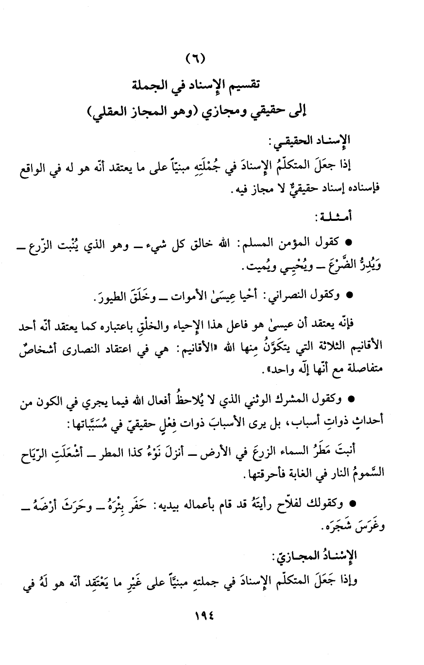 (6) تقسيم الإِسناد في الجملة إلى حقيقي ومجازي (وهو المجاز العقلي)