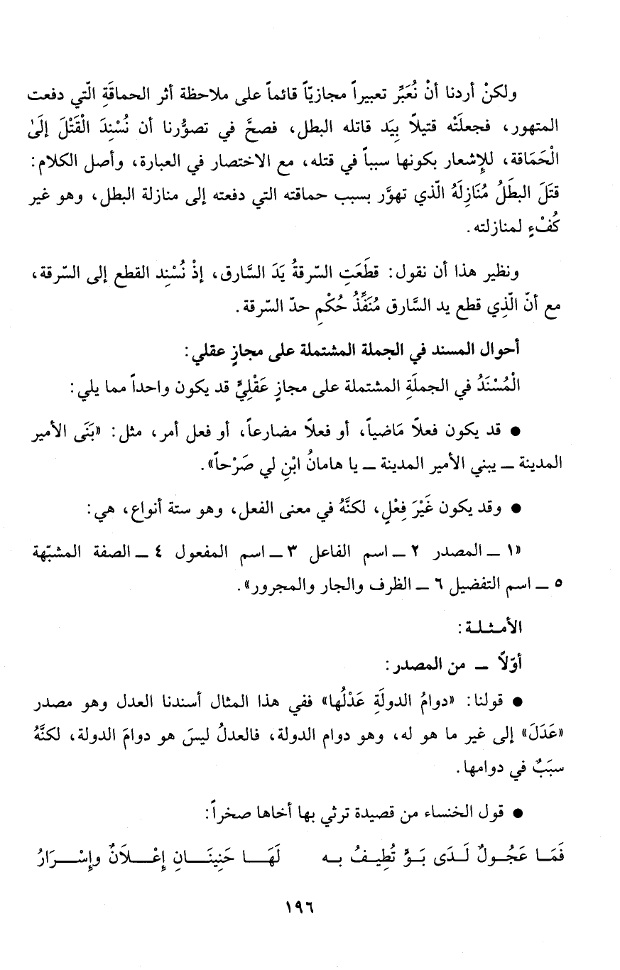 * قولنا: "دوامُ الدولَةِ عَدْلُها" ففي هذا المثال أسندنا العدل وهو مصدر "عَدَلَ" إلى غير ما هو له، وهو دوام الدولة، فالعدلُ ليسَ هو دوامَ الدولة، لكنَّهُ سبَبٌ في دوامها.