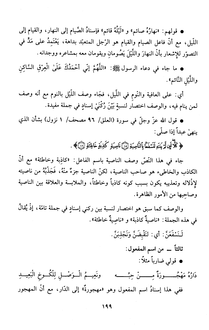 جاء في هذا النّصّ وصف الناصية باسم الفاعل: "كاذِبة وخاطئة" مع أنّ الكاذب والخاطىء هو صاحب الناصية، لكنّ الناصية جزءٌ منْهُ، فَجَذْبُهُ من ناصيته لإِذْلاله وتعذيبه يكون بسب كونه كاذباً وخاطئاً، والملابسة والعلاقة بين الناصية وصاحِبها من الأمور الظاهرة.