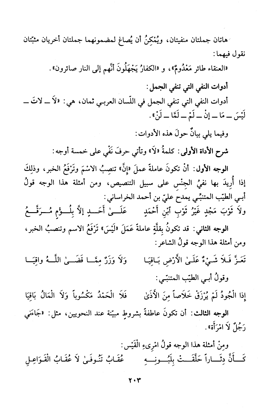 الوجه الأول: أنْ تكونَ عاملةً عملَ "إنَّ" تنصِبُ الاسْمَ وتَرْفَعُ الخبر، وذلِكَ إذا أُرِيدَ بها نفيُ الجِنْسِ على سبيل التنصيص، ومن أمثلة هذا الوجه قولُ أبي الطيّب المتنبِّي يمدح عليّ بن أحمد الخرساني: