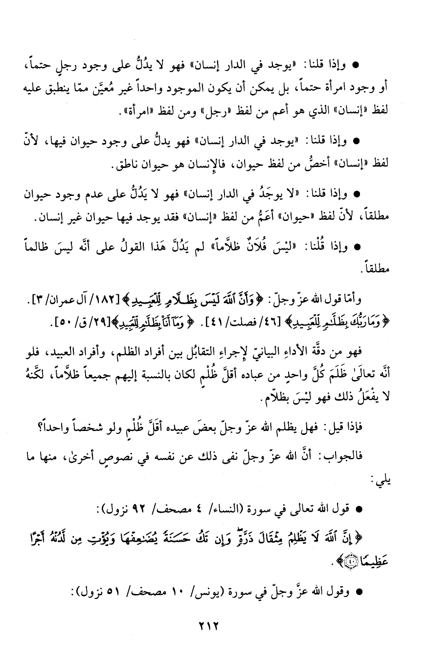 * وإذا قلنا: "يوجد في الدار إنسان" فهو لا يدُلُّ على أنه وجود رجلٍ حتماً، أو وجود امرأة حتماً، بل يمكن أن يكون الموجود واحداً غير مُعيَّن ممّا ينطبق عليه لفظ "إنسان" الذي هو أعم من لفظ "رجل" ومن لفظ "امرأة".