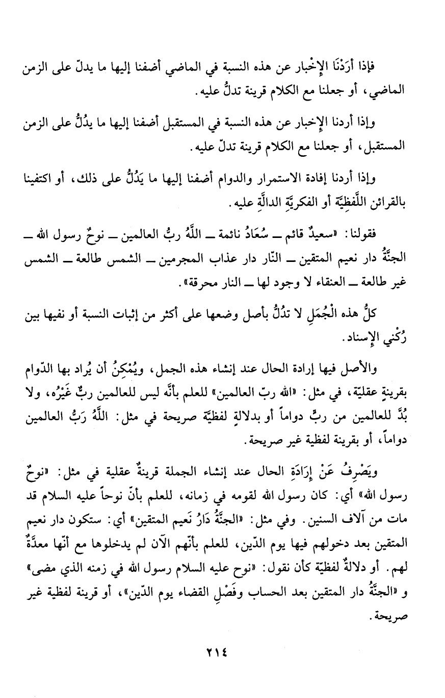 ويَصْرِفُ عَنْ إِرَادَةِ الحال عند إنشاء الجملة قرينةٌ عقلية في مثل: "نوحٌ رسول الله" أي: كان رسول الله لقومه في زمانه، للعمل بأنّ نوحاً عليه السلام قد مات من آلاف السنين، وفي مثل: "الجنَّةُ دَارُ نَعيم المتقين" أي: ستكون دار نعيم المتقين بعد دخولهم فيها يوم الدّين، للعلم بأنّهم الآن لم يدخلوها مع أنّها معدَّةٌ لهم. أو دلالةٌ لفظيّة كأن نقول: "نوح عليه السلام رسول الله في زمنه الذي مضى" و"الجنَّةُ دار المتقين بعد الحساب وفَصْلِ القضاء يوم الدّين"، أو قرينة لفظية غير صريحة.