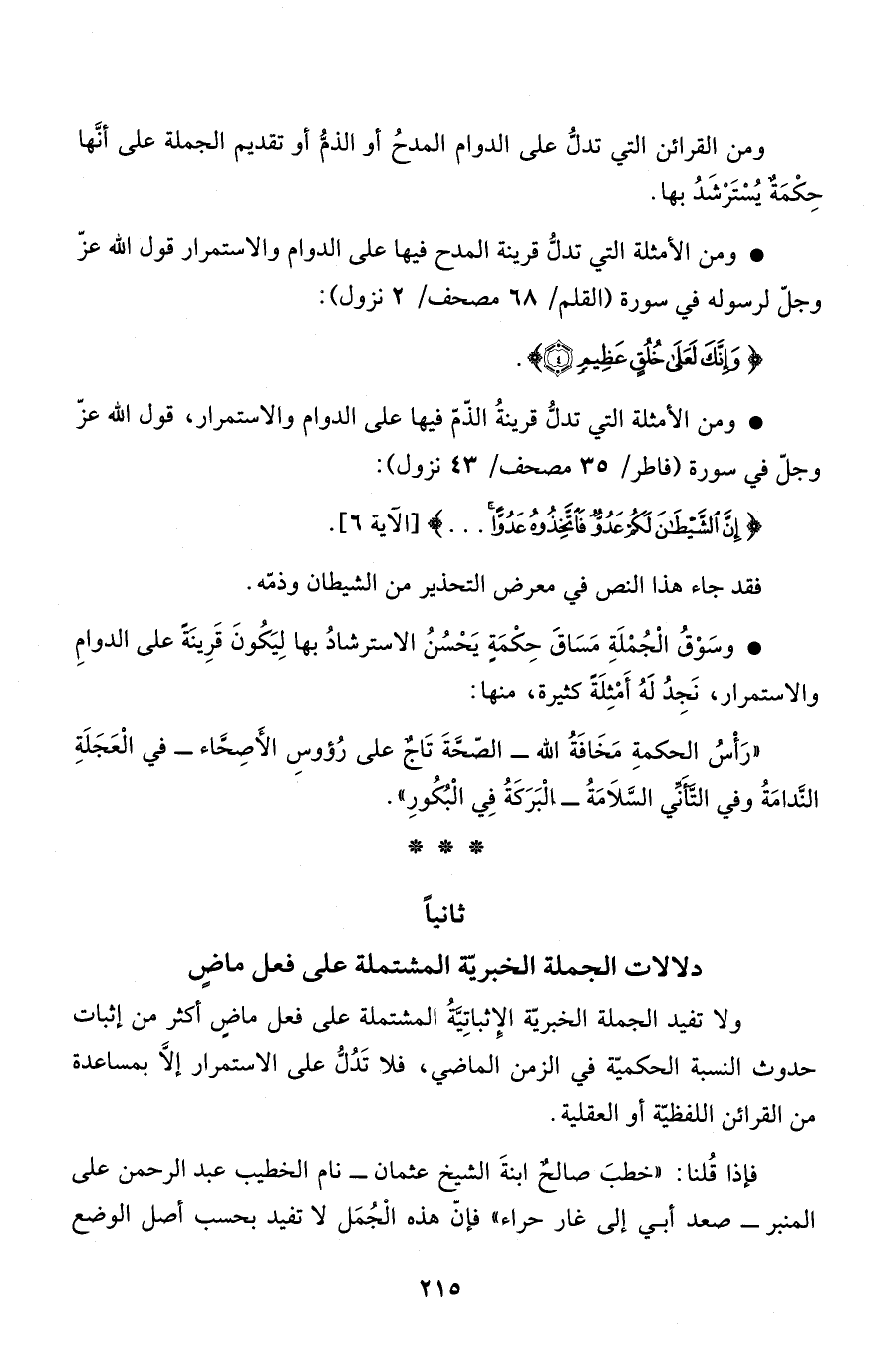 ومن القرائن التي تدلُّ على الدوام المدحُ أو الذمُّ أو تقديم الجملة على أنَّها حِكْمَةٌ يُسْتَرْشَدُ بها.