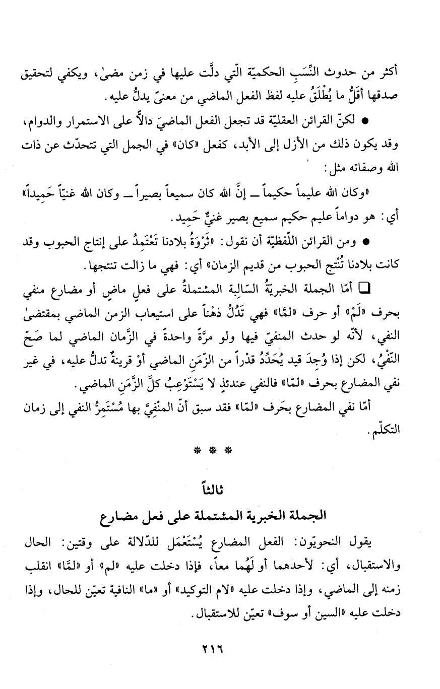 أمّا الجملة الخبريّةُ السّالِبة المشتملةُ على فعلٍ ماضٍ أومضارع منفي بحرف "لَمْ" أو حرف "لمَّا" فهي تَدُلُّ ذهْناً على استيعاب الزمن الماضي بمقتضى النفي، لأنّه لو حدث المنفيّ فيها ولو مرَّةً واحدةً في الزَّمان الماضي لما صَحَ النّفْيُ، لكن إذا وُجِدَ قيد يُحَدِّدُ قدْراً من الزّمنِ الماضي أوْ قرينةٌ تدلُّ عليه، في غير نفي المضارع بحرف "لمّا" فالنفي عندئذٍ لا يَسْتَوْعِبُ كلَّ الزَّمَنِ الماضي.