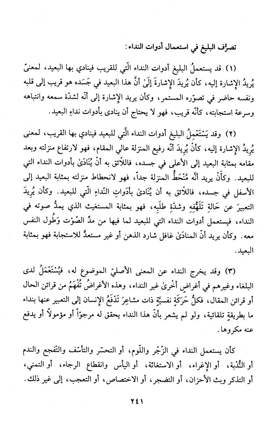 (2) وقد يَسْتَعْمِلُ البليغ أدوات النداء الَّتي للبعيد فينادي بها القريب، لمعنى يُرِيدُ الإِشارة إليه، كأنْ يُرِيدَ أنّه رفيع المنزلة عالي المقام، فهو لارتفاع منزلته وبعد مقامه بمثابة البعيد إلى الأعلى في جسده، فاللاّئق به أنْ يُنَادَى بأدوات النداء التي للبعيد. وكأَنْ يريد أنَّه مُنْحَطُّ المنزلة جداً، فهو لانحطاط منزلته بمثابة البعيد إلى الأسفل في جسده، فاللاّئق به أن يُنَادى بأدَواتِ النّداءِ الّتي للبعيد. وكأن يُرِيدَ التعبيرَ عن حَالةِ تَلَهُّفِهِ وشدّةِ طلَبِه، فهو بمثابة المستغيث الذي يمدُّ صوته في النداء، فيستعمل أدوات النداء التي للبعيد لما فيها من مدِّ الصّوْت وَطُول النفس معه. وكأن يريد أنّ المنادَى غافل شارد الذهن أو غير مستعدٍّ للاستجابة فهو بمثابة البعيد.