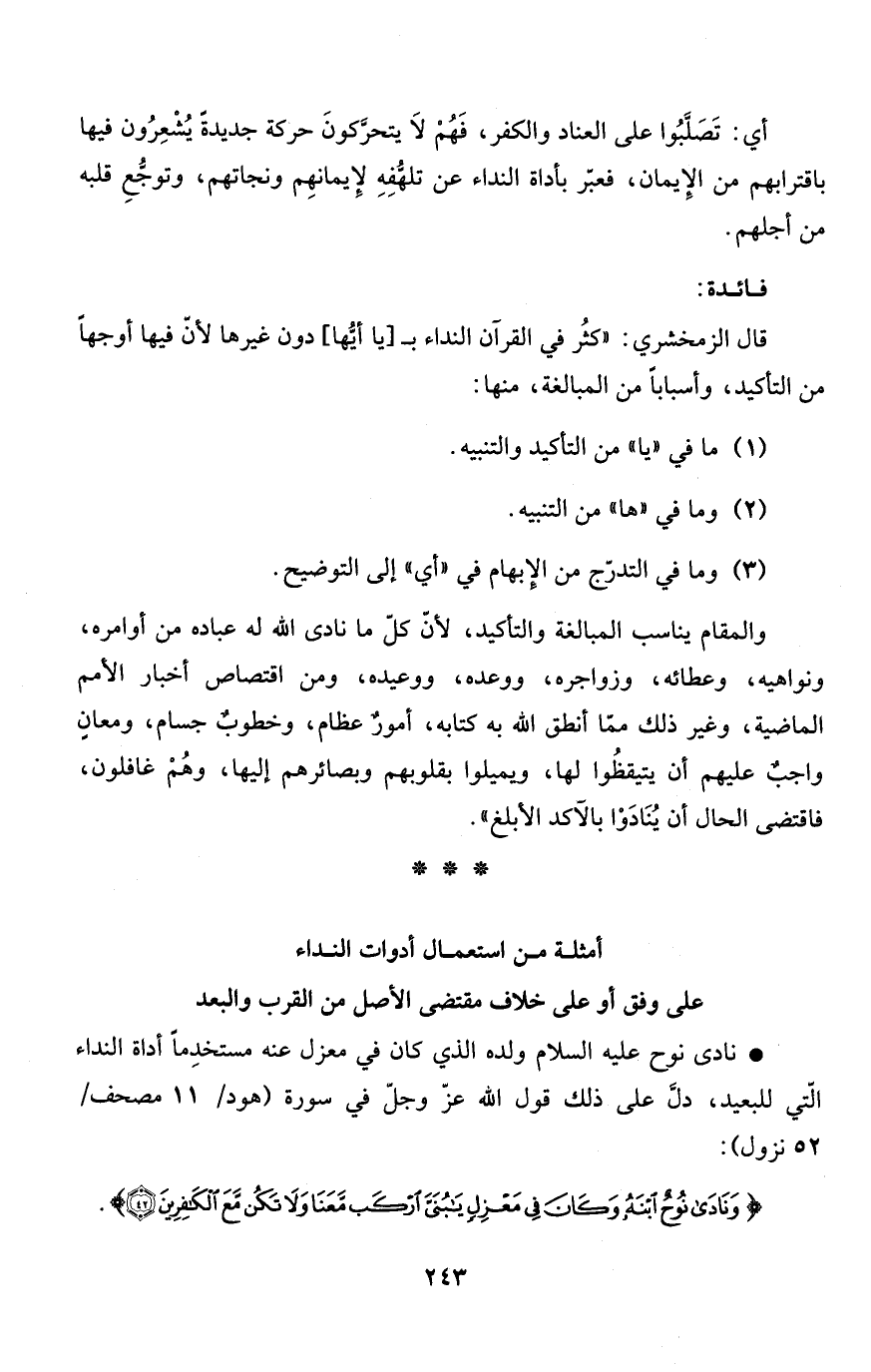 * نادى نوح عليه السلام ولده الذي كان في معزل عنه مستخدِماً أداة النداء الّتي للبعيد، دلَّ على ذلك قول الله عزّ وجلّ في سورة (هود/11 مصحف/ 52 نزول) :