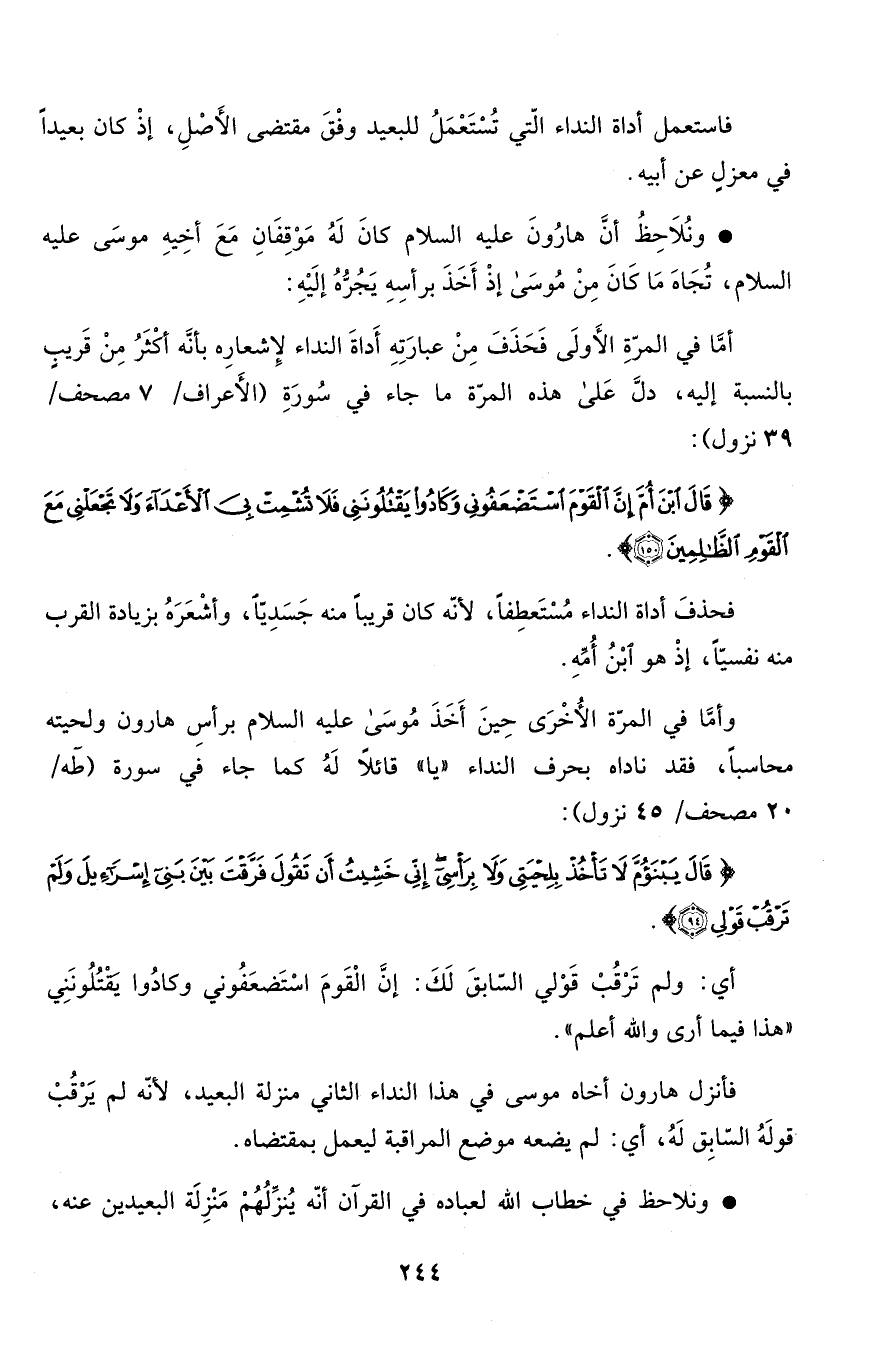 وأمَّا في المرّة الأُخْرَى حِينَ أَخَذَ مُوسَى عليه السلام برأسِ هارون ولحيته محاسباً، فقد ناداه بحرف النداء "يا" قائلاً لَهُ كما جاء في سورة (طَه/ 20 مصحف/ 45 نزول) :