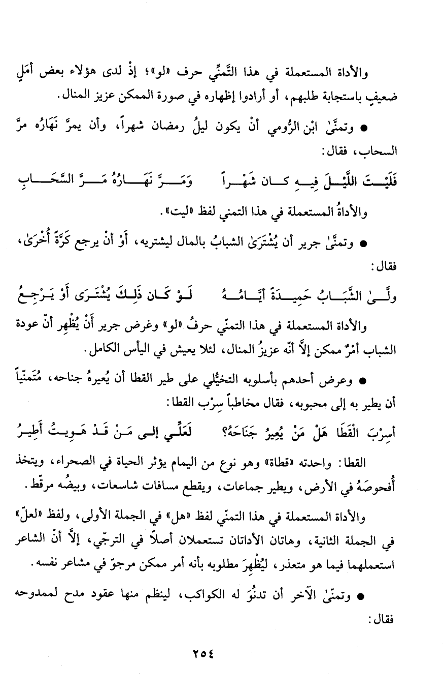 والأداة المستعملة في هذا التمنّي حرفُ "لو" وغرض جرير أَنْ يُظْهِر أنّ عودة الشباب أمْرٌ ممكن إلاَّ أنّه عزيزُ المنال، لئلا يعيش في اليأس الكامل.