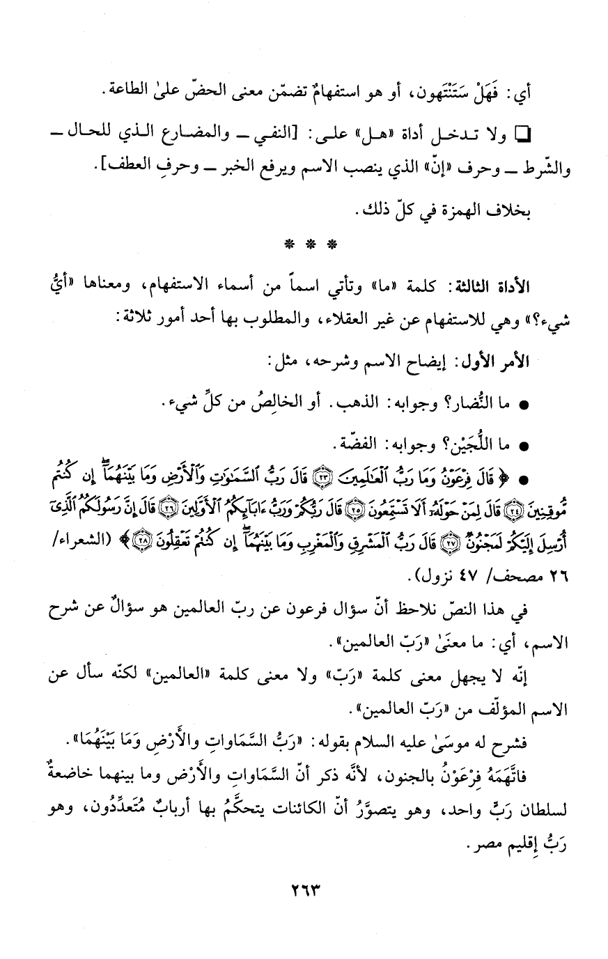 في هذا النصّ نلاحظ أنّ سؤال فرعون عن ربّ العالمين هو سؤالٌ عن شرح الاسم، أي: ما معنَى "رَبّ العالمين".