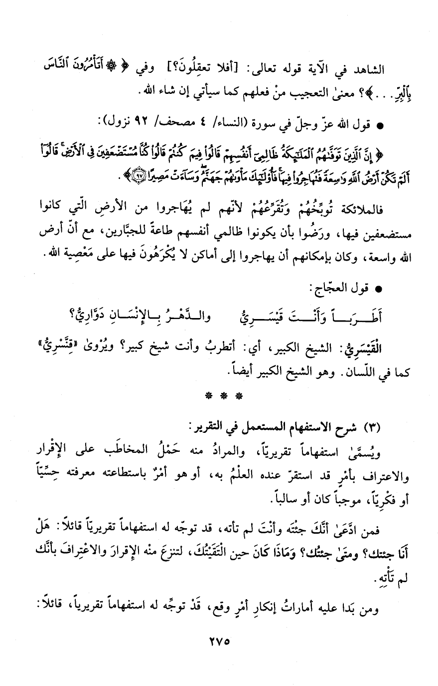 فمن ادَّعَى أنَّكَ جئْتَه وأنْتَ لم تأته، قد توجّه له استفهاماً تقريريّاً قائلاً: هَلْ أَنَا جئتك؟ ومتَى جئتُك؟ وَمَاذَا كَانَ حين الْتَقَيْتُكَ، لتنزعَ منْه الإِقرارَ والاعْتِرافَ بأنَّك لم تَأْتِهِ.