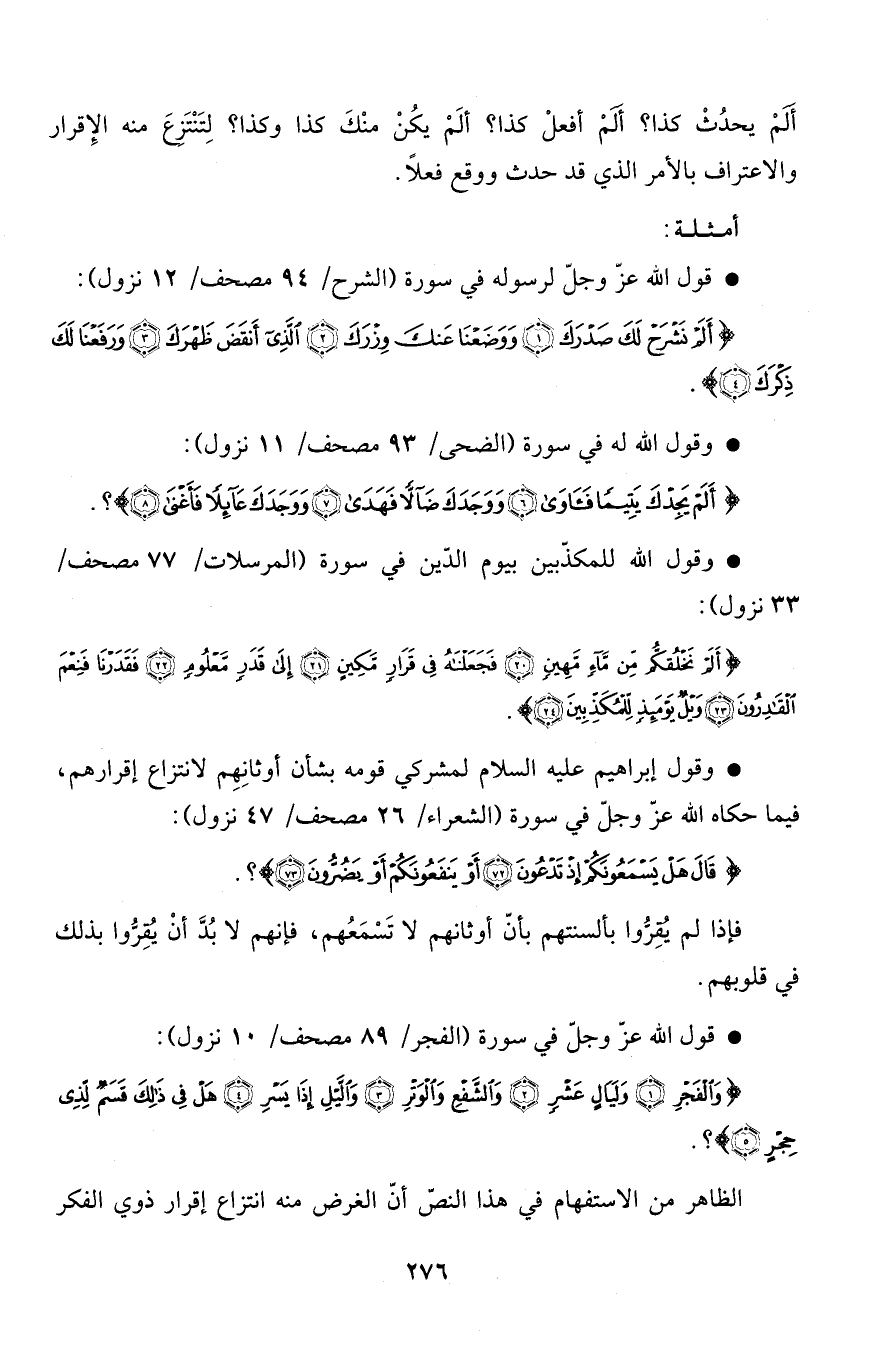 {والفجر * وَلَيالٍ عَشْرٍ * والشفع والوتر * والليل إِذَا يَسْرِ * هَلْ فِي ذَلِكَ قَسَمٌ لِّذِى حِجْرٍ} ؟ [الآيات: 1 - 5] .