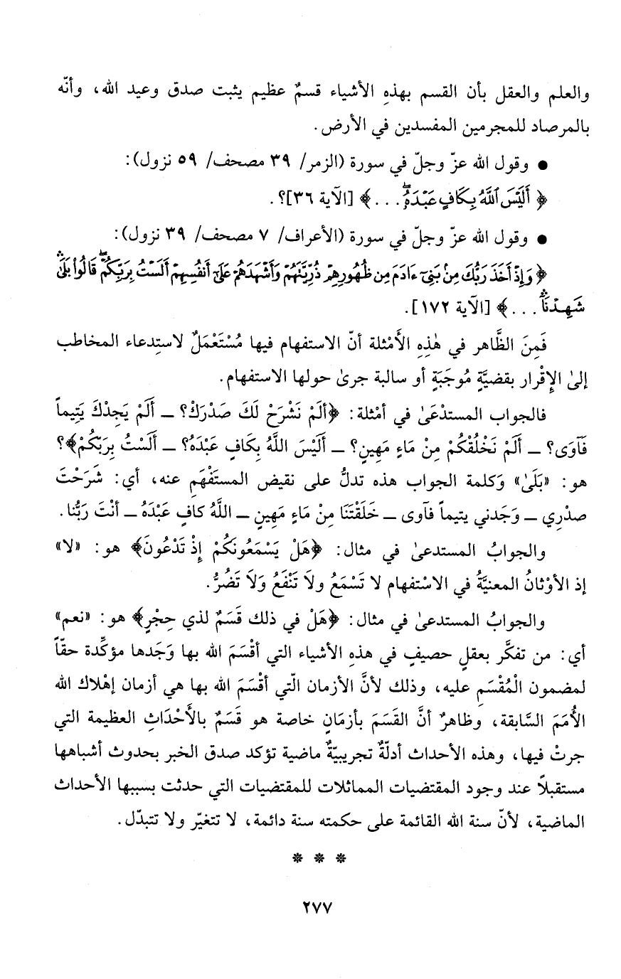 والجوابُ المستدعى في مثال: {هَلْ فِي ذَلِكَ قَسَمٌ لِّذِى حِجْرٍ} [الفجر: 5] هو: "نعم" أي: من تفكَّر بعقلٍ حصيفٍ في هذهِ الأشياء التي أقْسَمَ الله بها وَجَدها مؤكِّدة حقّاً لمضمون الْمُقْسَمِ عليه، وذلك لأنَّ الأزمان الّتي أقْسَمَ الله بها هي أزمان إهْلاك الله الأُمَمَ السَّابقة، وظاهرٌ أنَّ القَسَمَ بأزمَانٍ خاصة هو قَسَمٌ بالأَحْدَاثِ العظيمة التي جرتْ فيها، وهذه الأحداث أدلّةٌ تجريبيّةٌ ماضية تؤكد صدق الخبر بحدوث أشباهها مستقبلاً عند وجود المقتضيات المماثلات للمتقضيات التي حدثت بسببها الأحداث الماضية، لأنّ سنة الله القائمة على حكمته سنة دائمة، لا تتغيّر ولا تتبدّل.